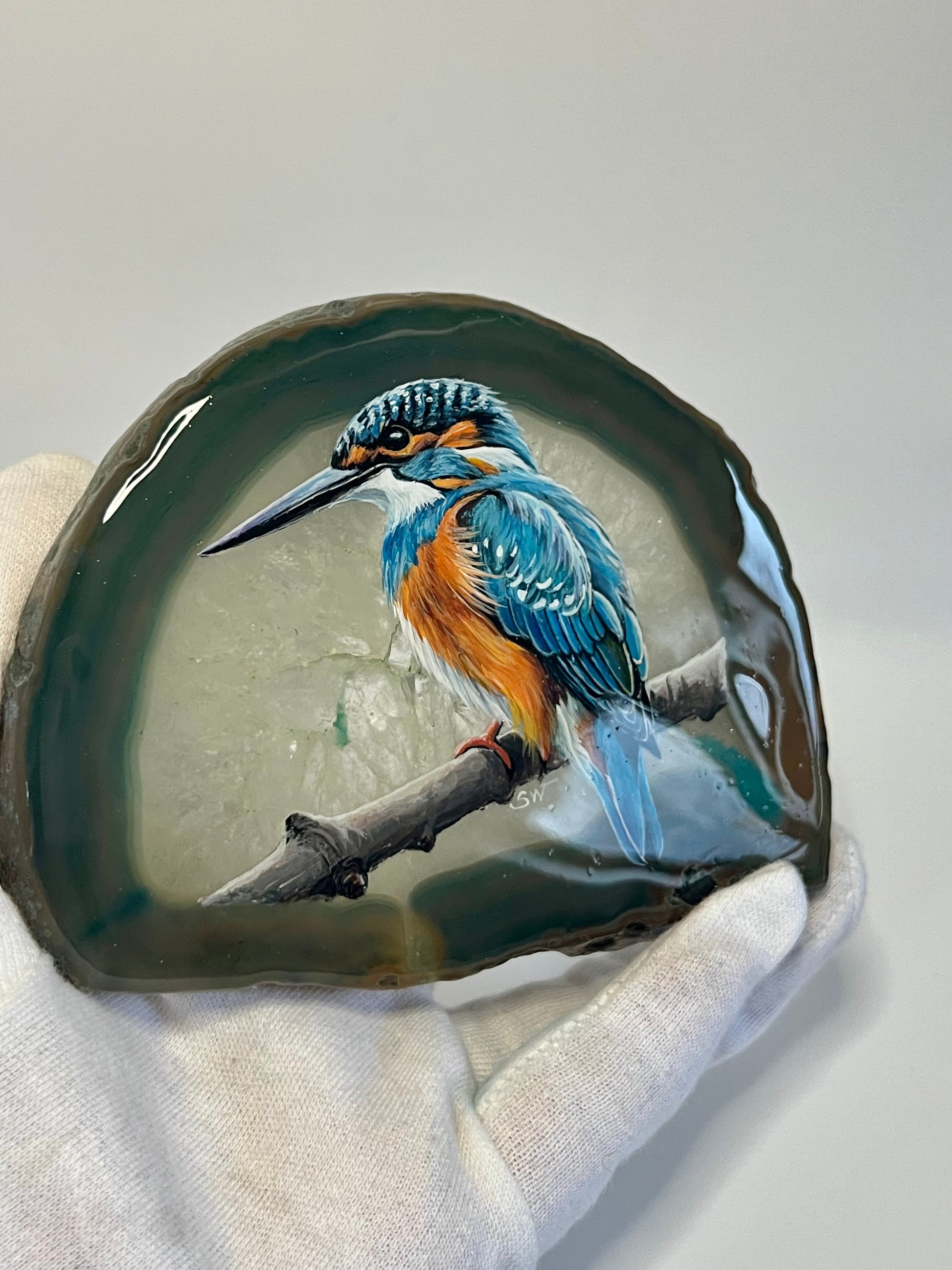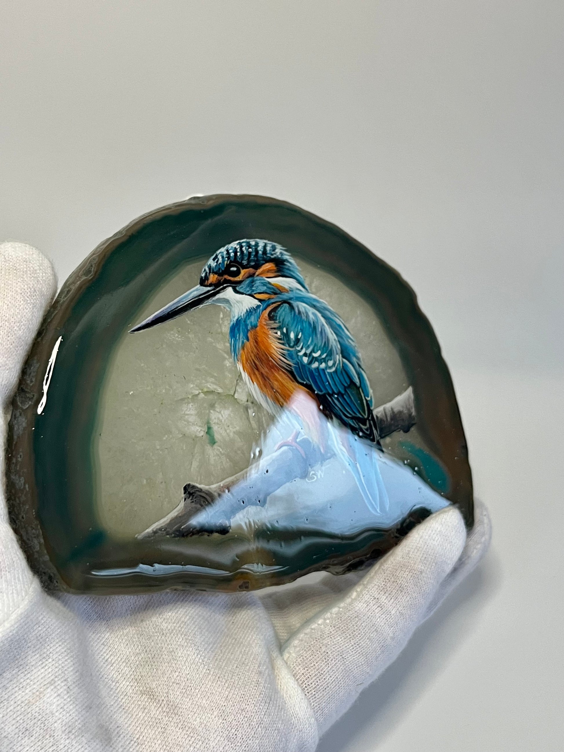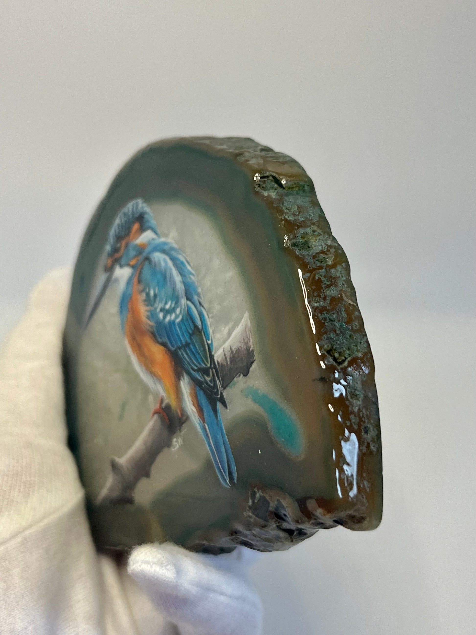 Einzigartige handbemalte Achatscheibe /der Eisvogel/ink.Metallständer