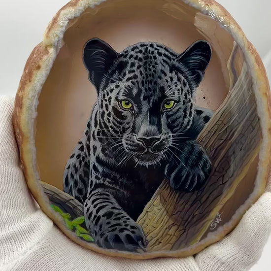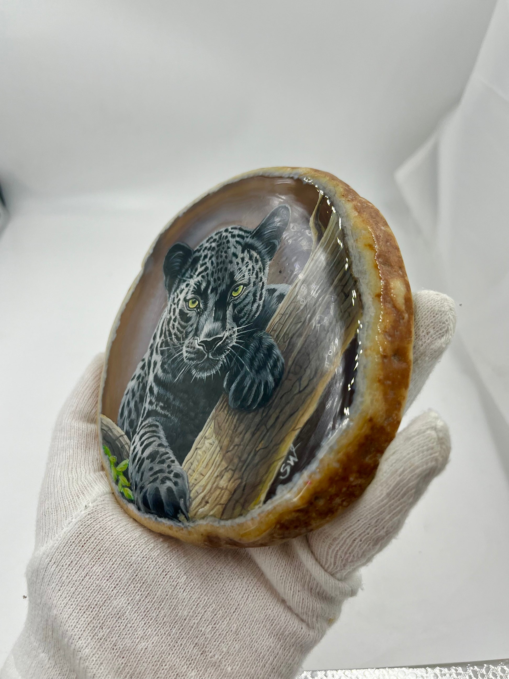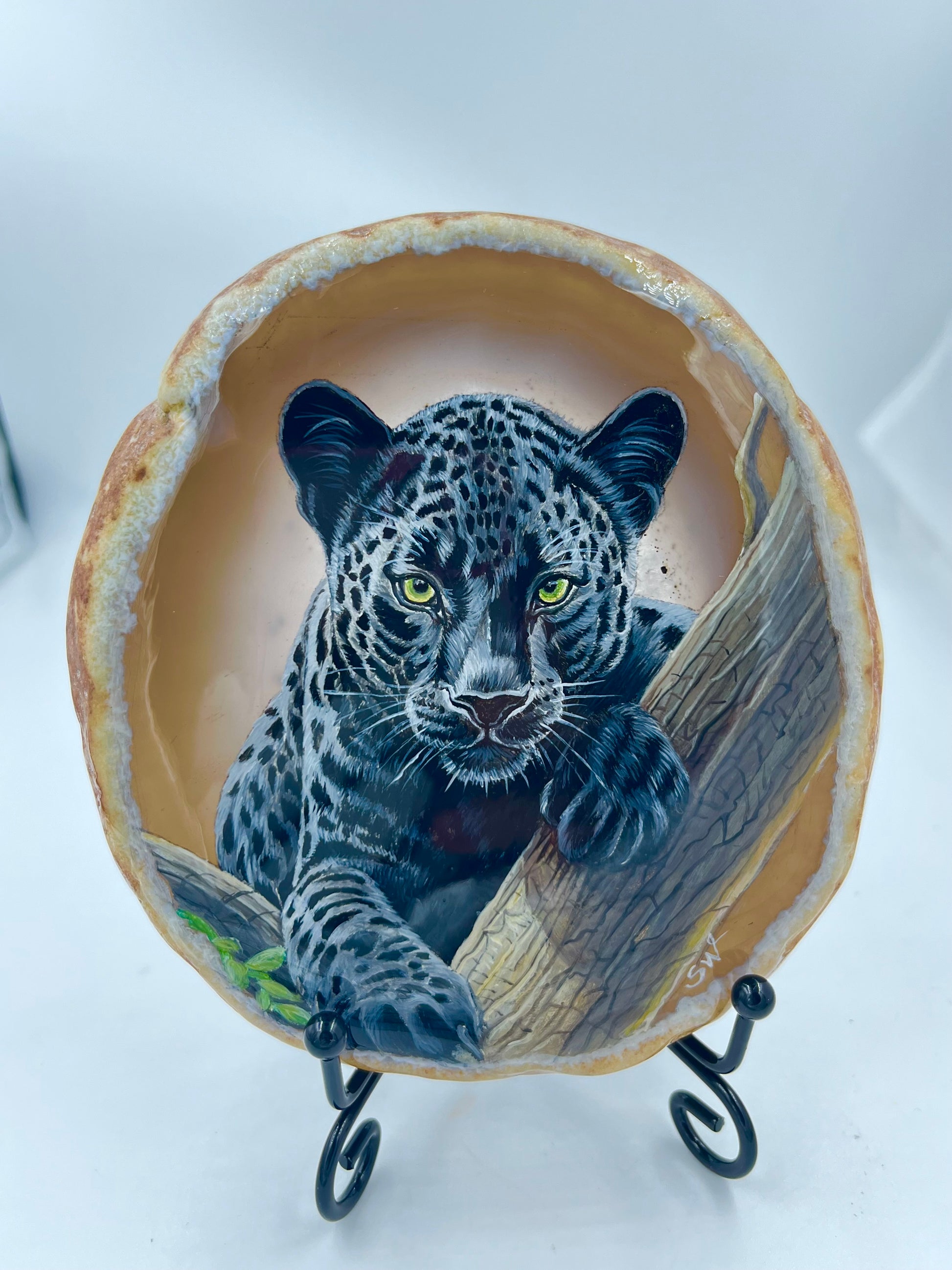 Einzigartige bemalt Achatscheibe/Ein schwarzer Panther /Hand bemalt /Deko/Tierpotrait/ink.Metallständer