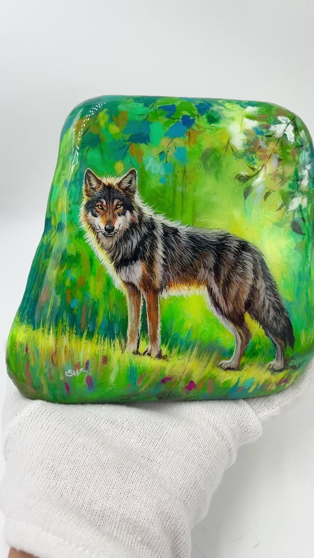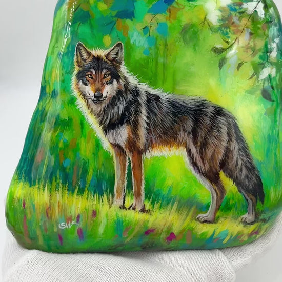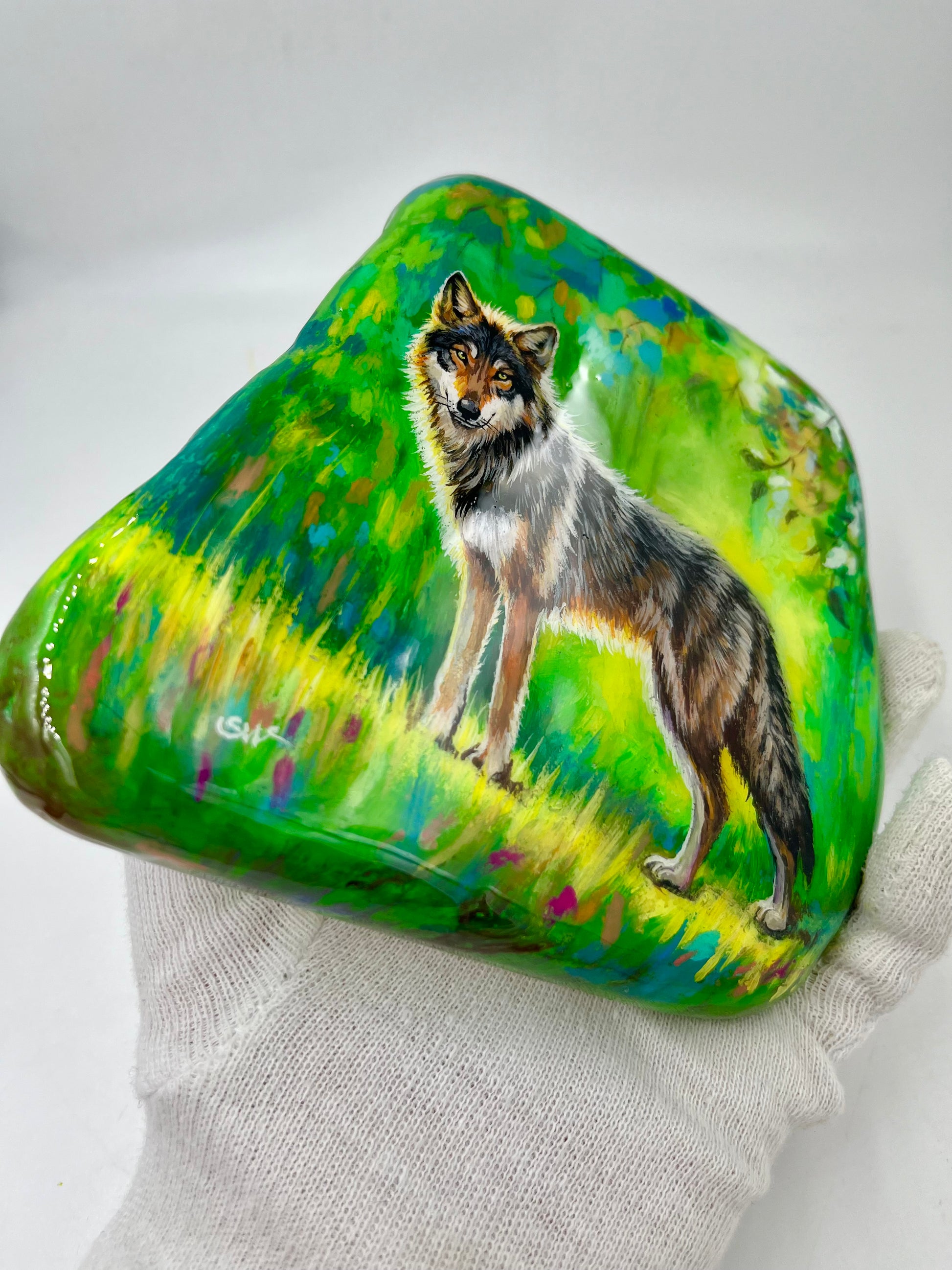Einzigartig handbemalte Stein/der Wolf /inklusive Tischstaffelei