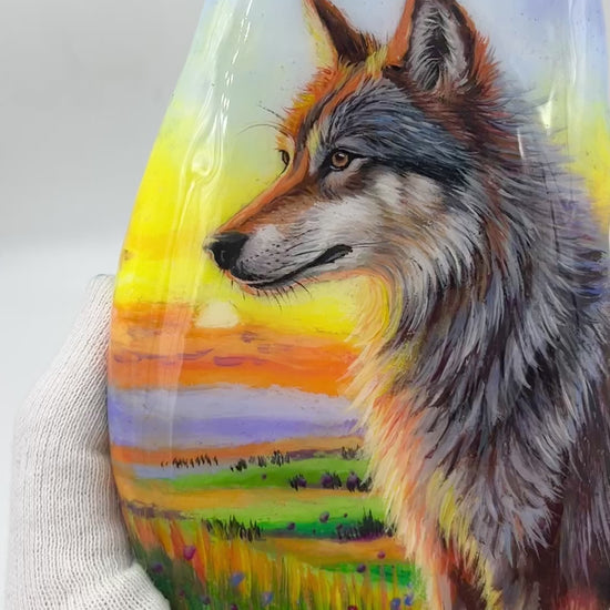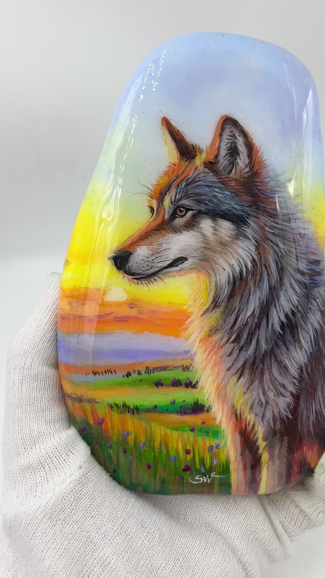 Einzigartig handbemalte Stein/Der Wolf im Abendlicht /inklusive Tischstaffelei