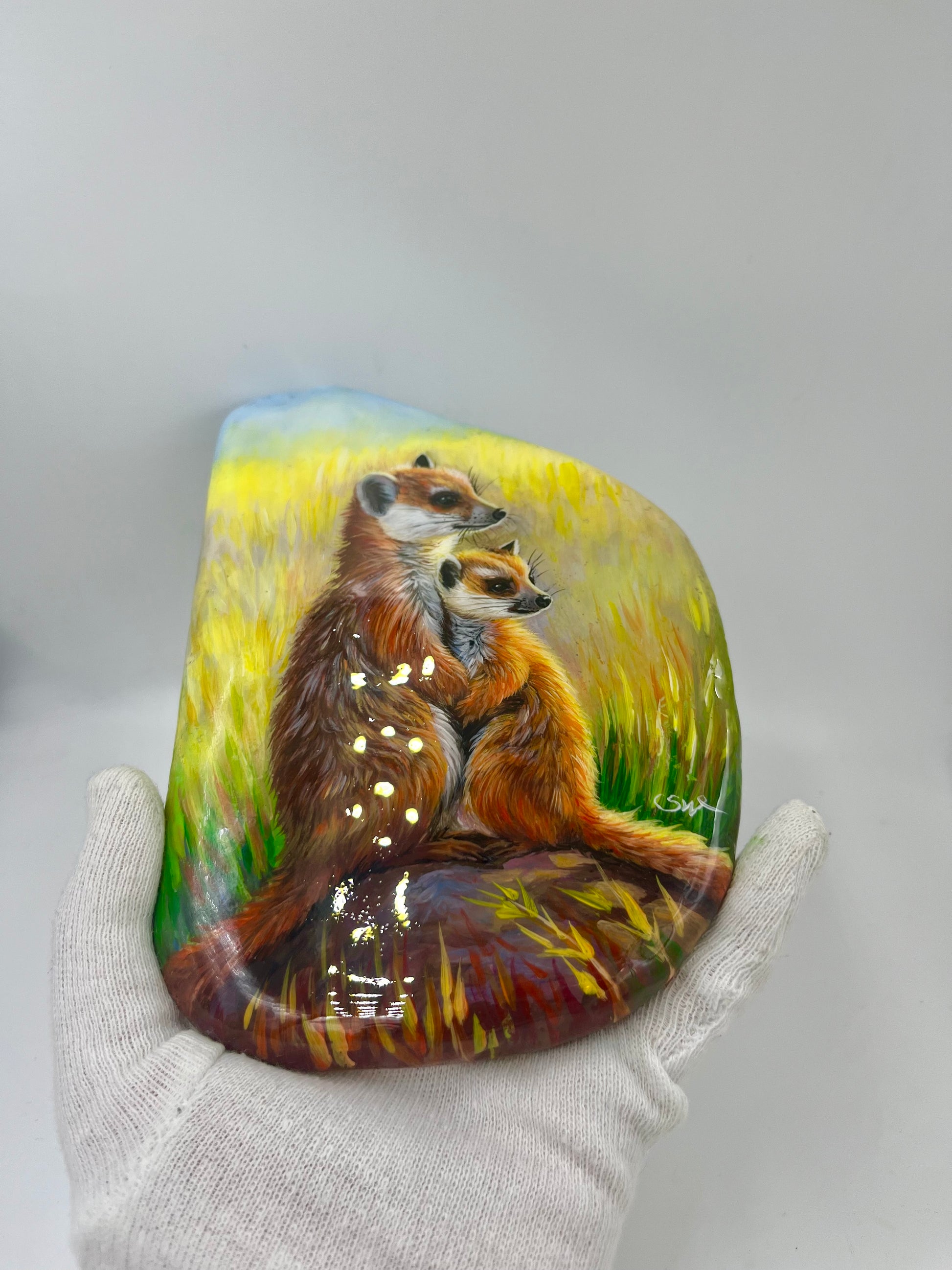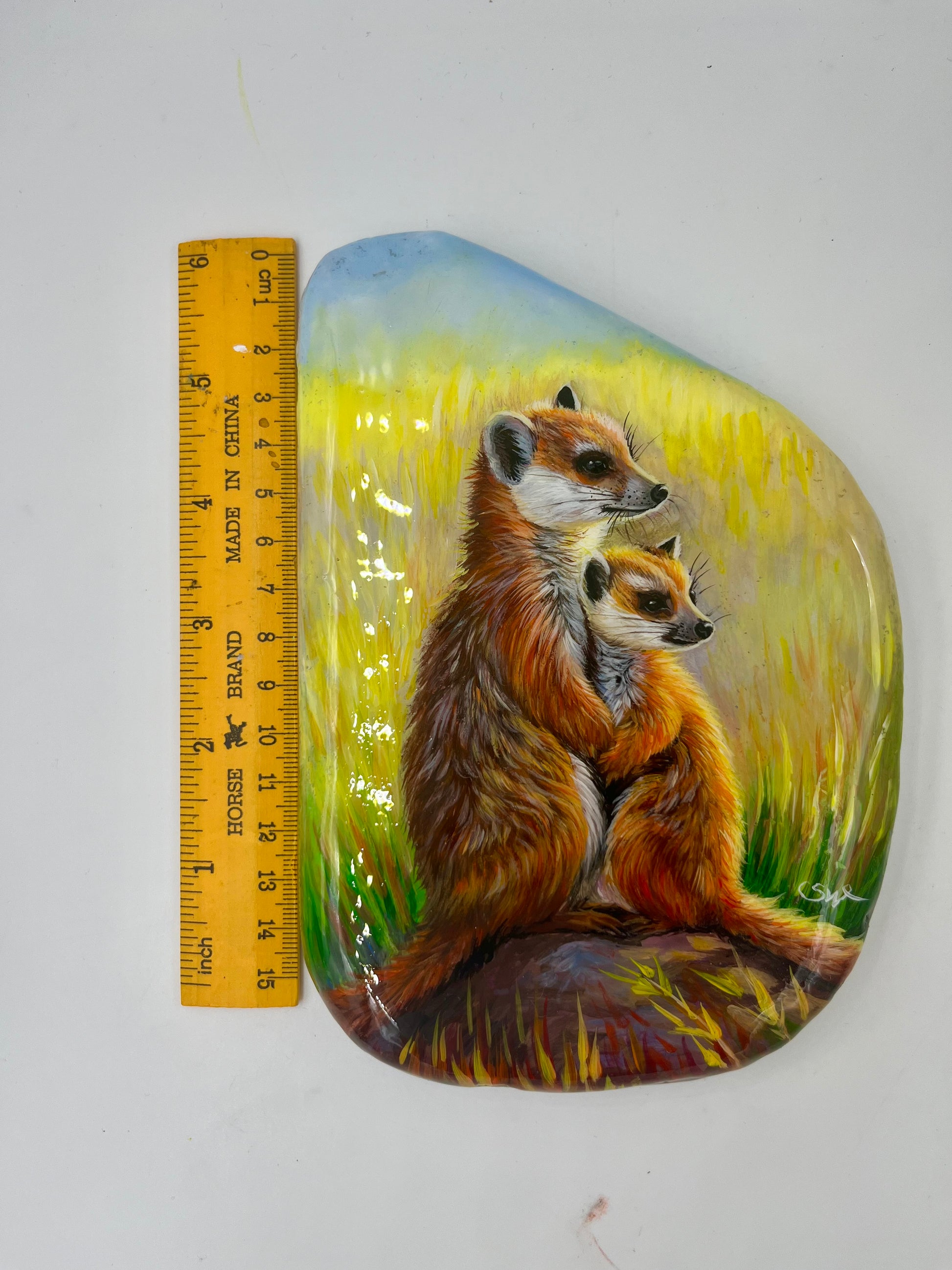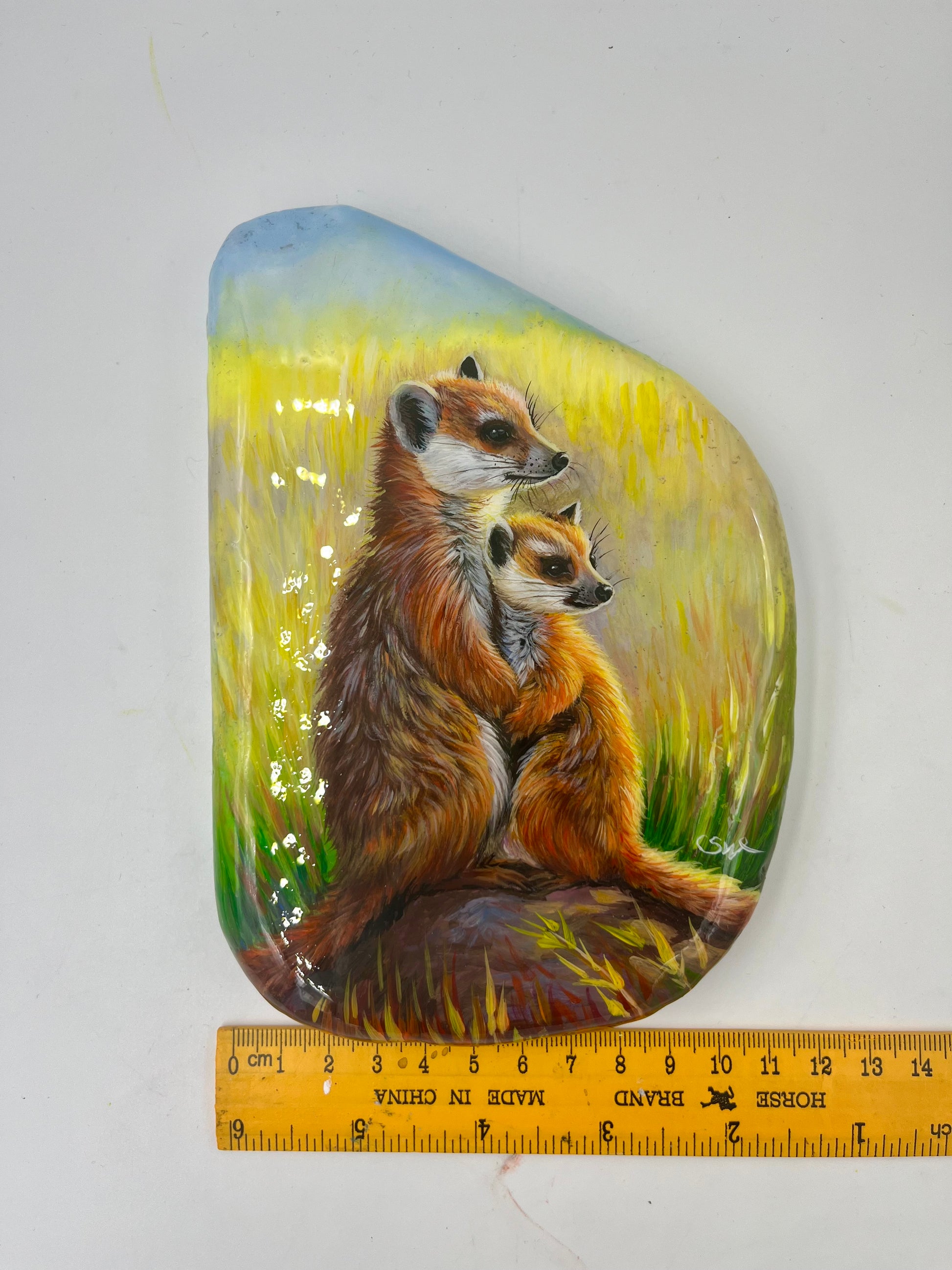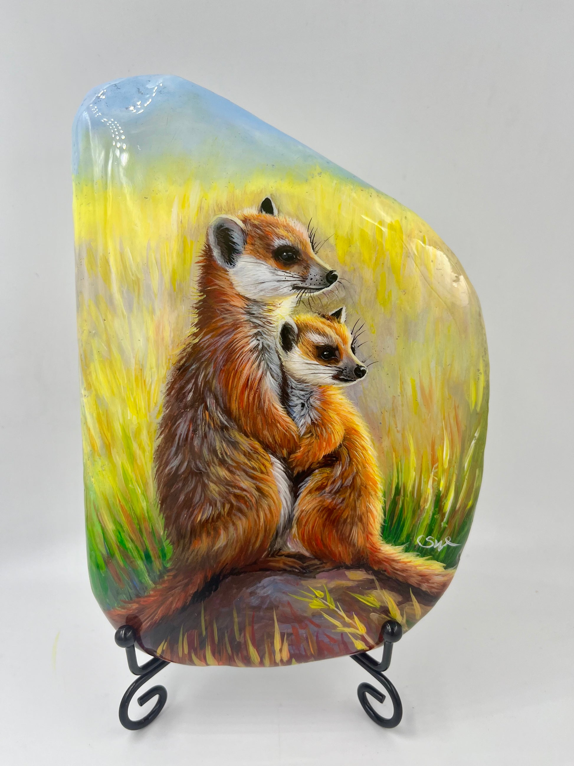 Einzigartig handbemalte Stein/Erdmännchen Mutter und ihre Jungen /inklusive Tischstaffelei