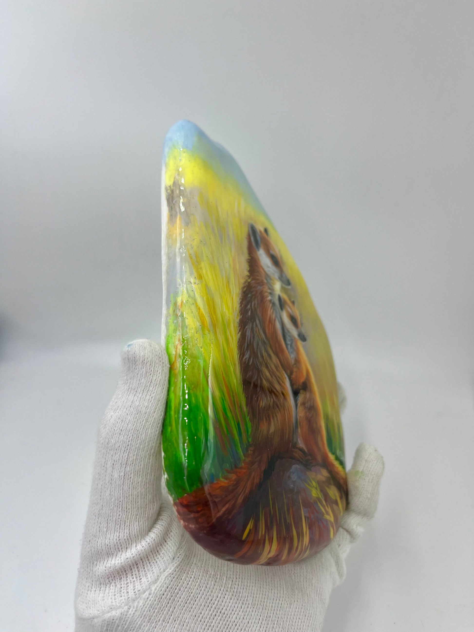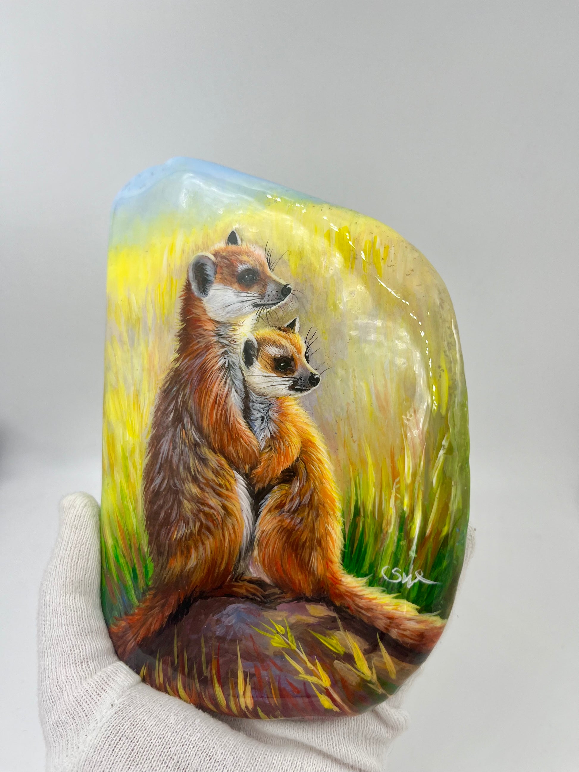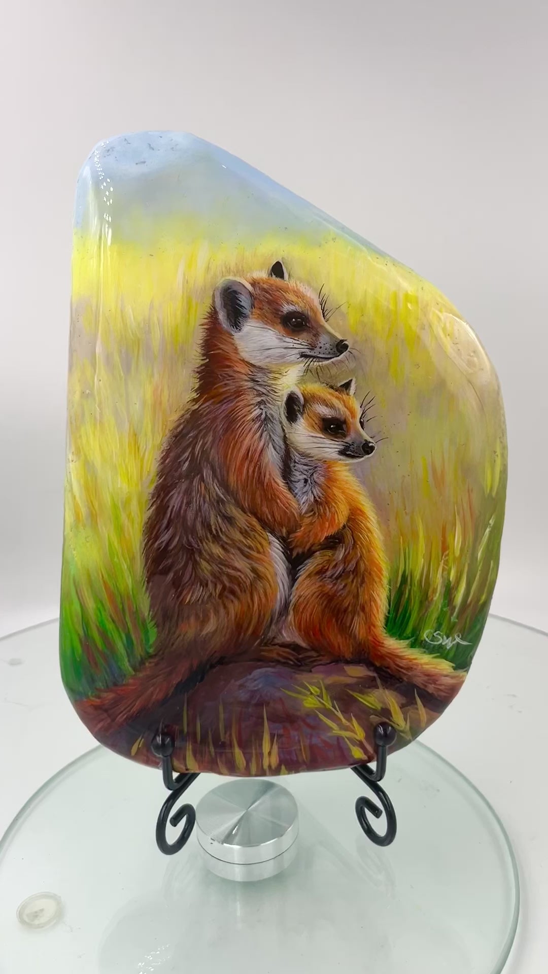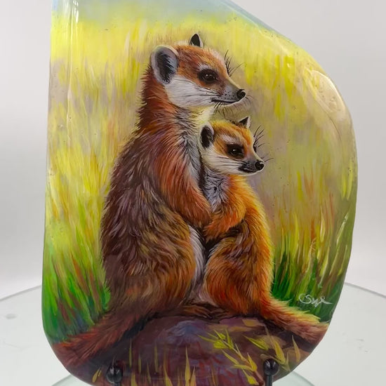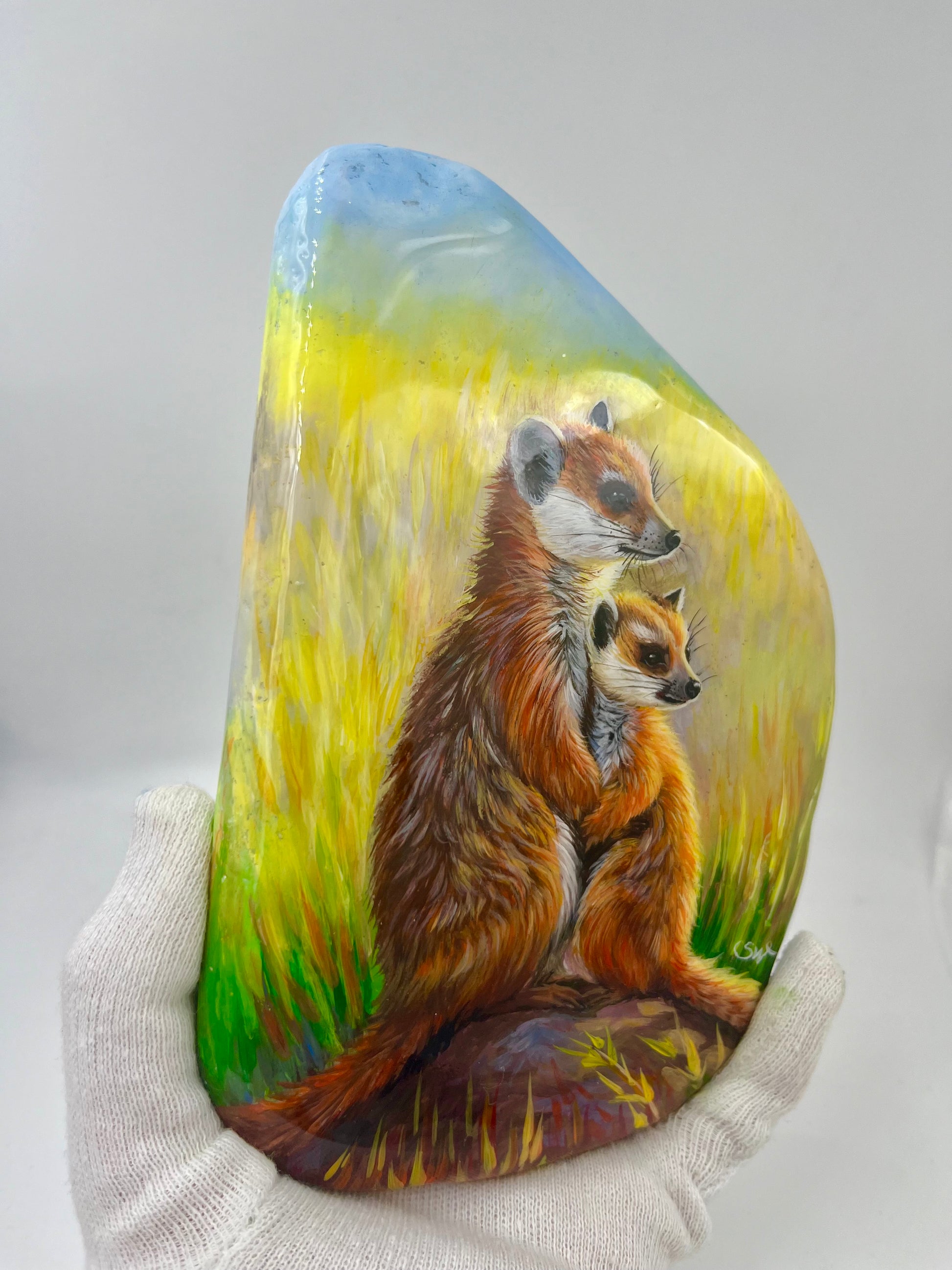 Einzigartig handbemalte Stein/Erdmännchen Mutter und ihre Jungen /inklusive Tischstaffelei