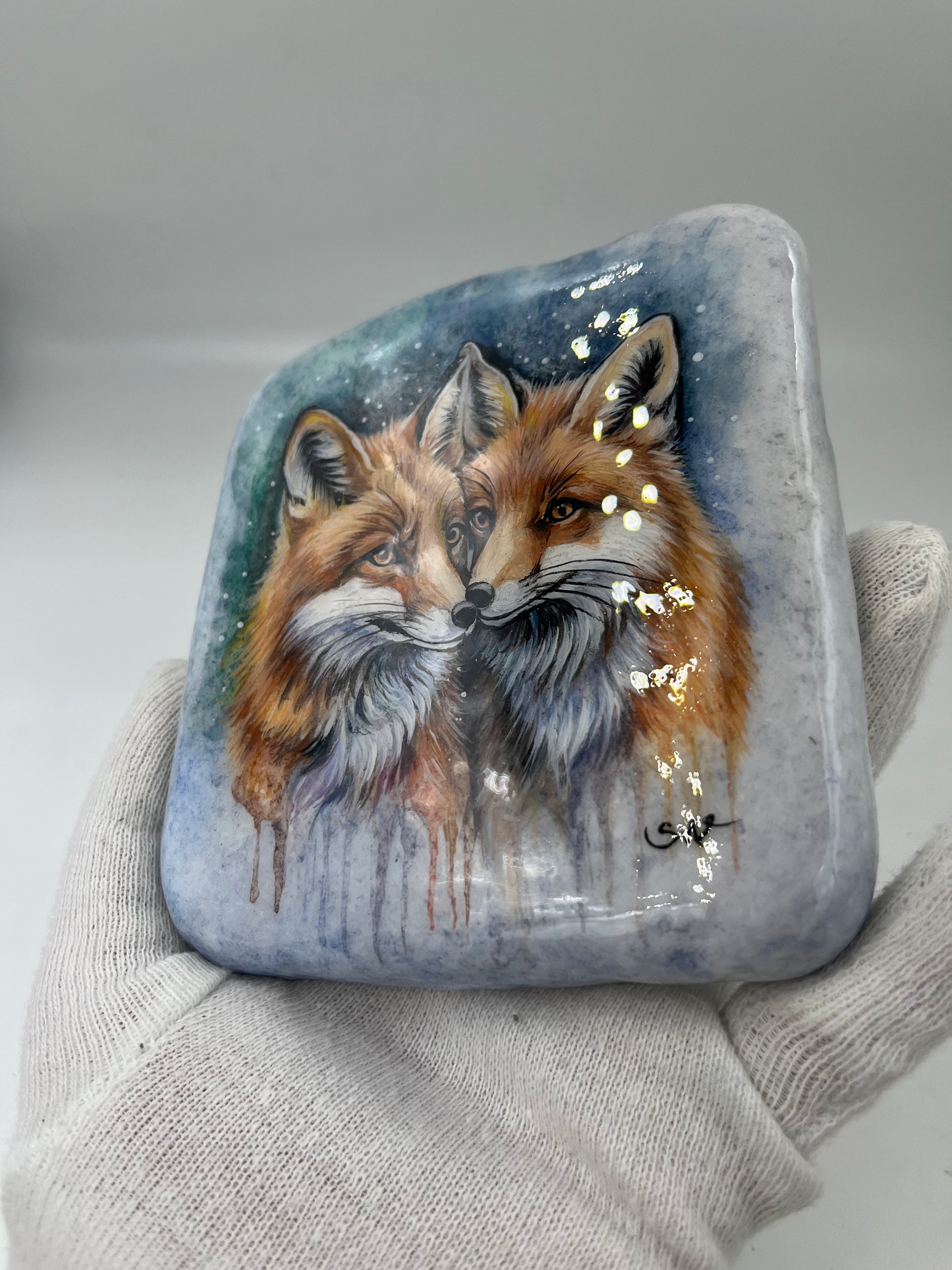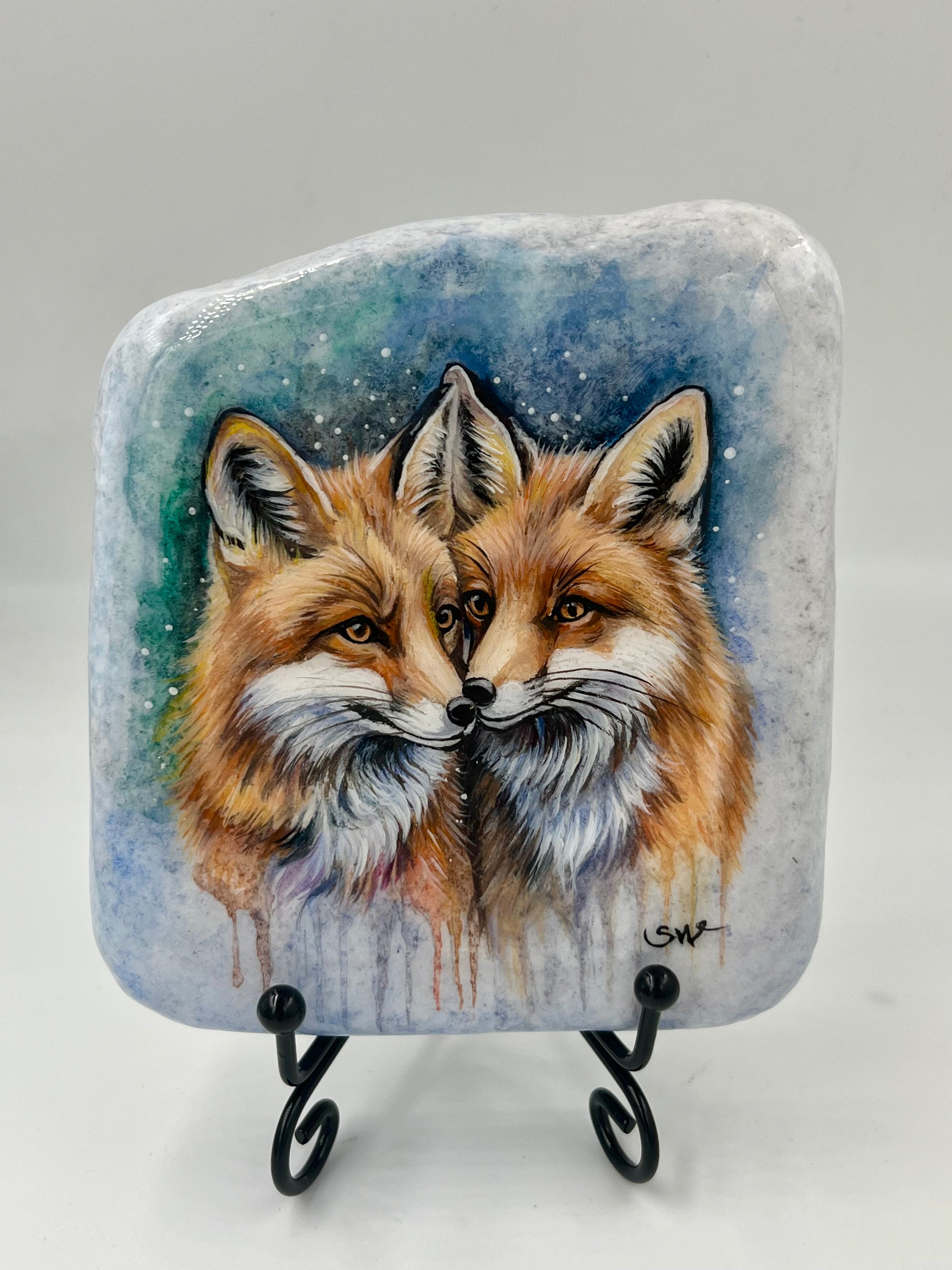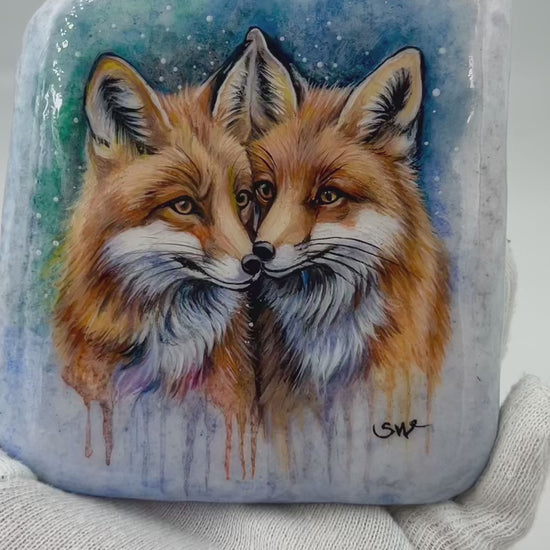 Einzigartig handbemalte Stein/Zwei Fuchs /inklusive Tischstaffelei