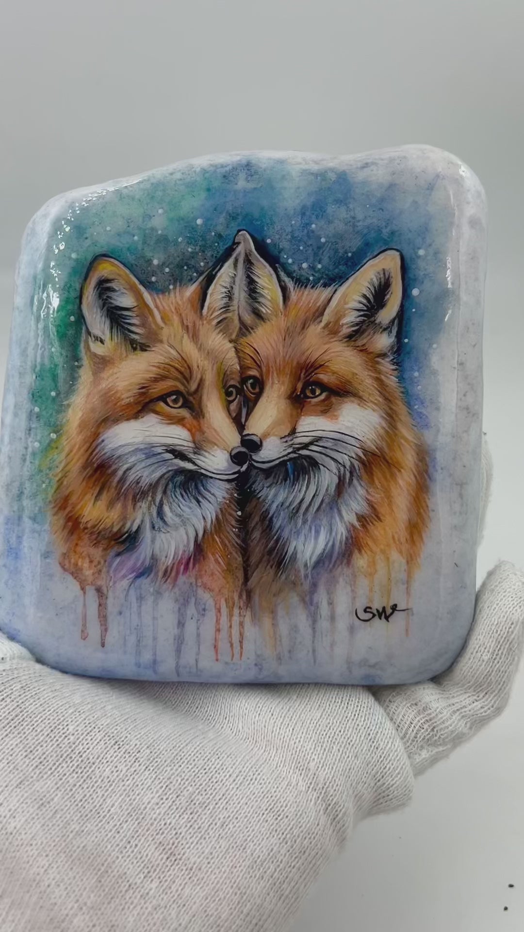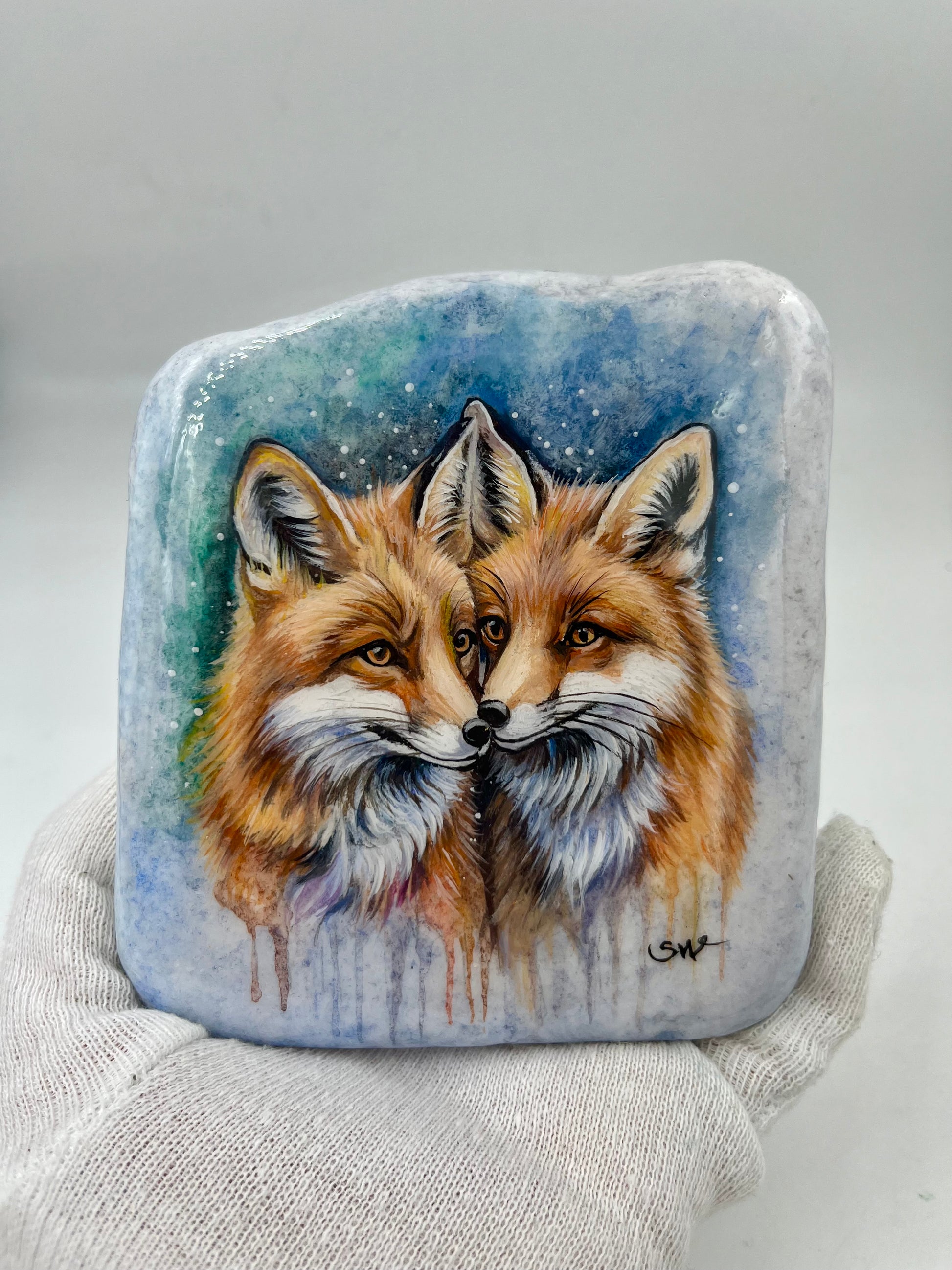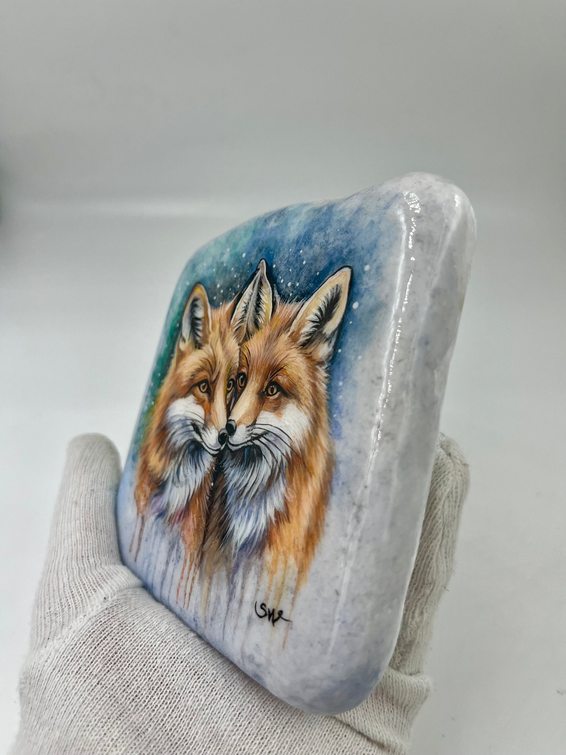 Einzigartig handbemalte Stein/Zwei Fuchs /inklusive Tischstaffelei