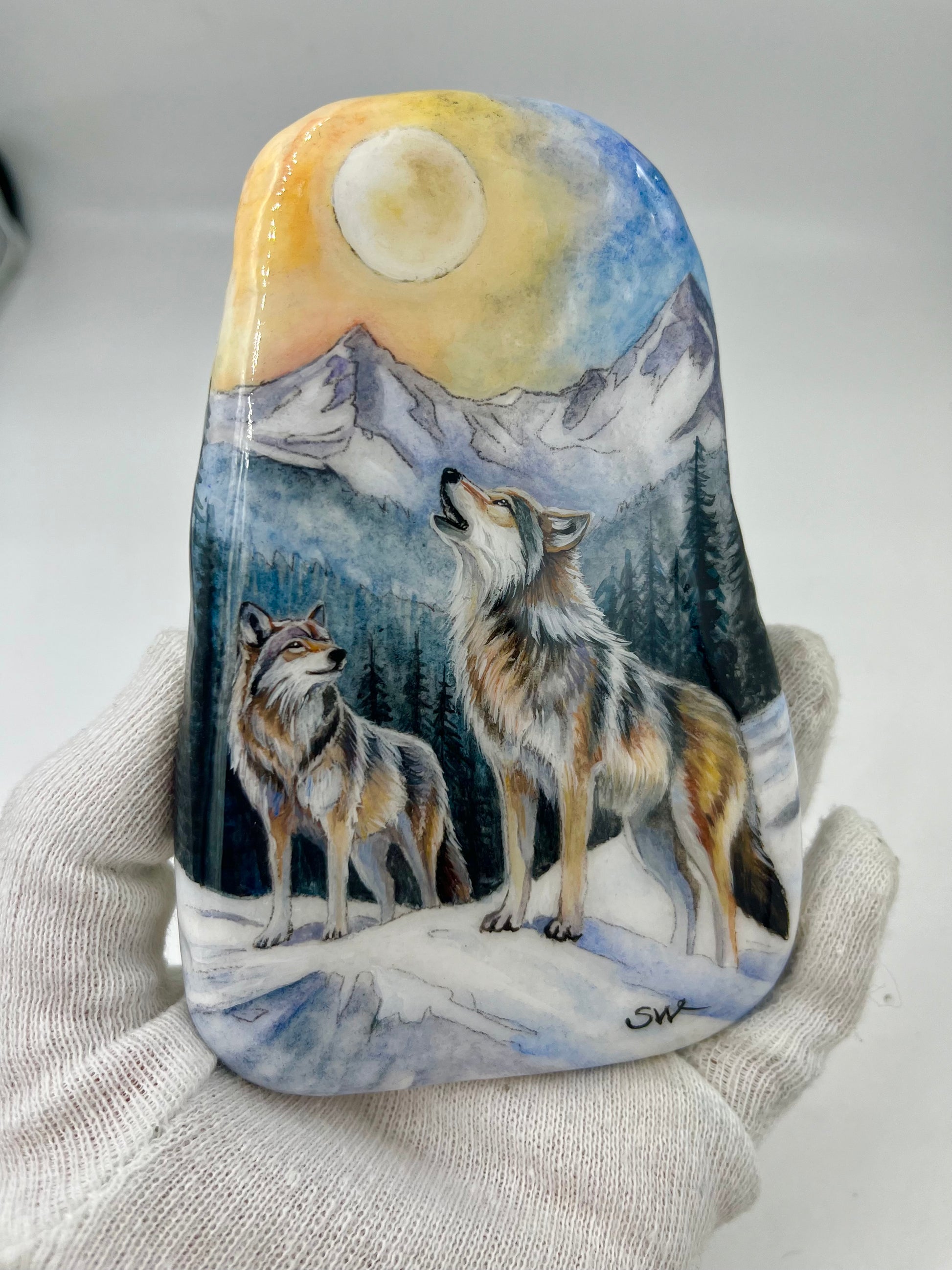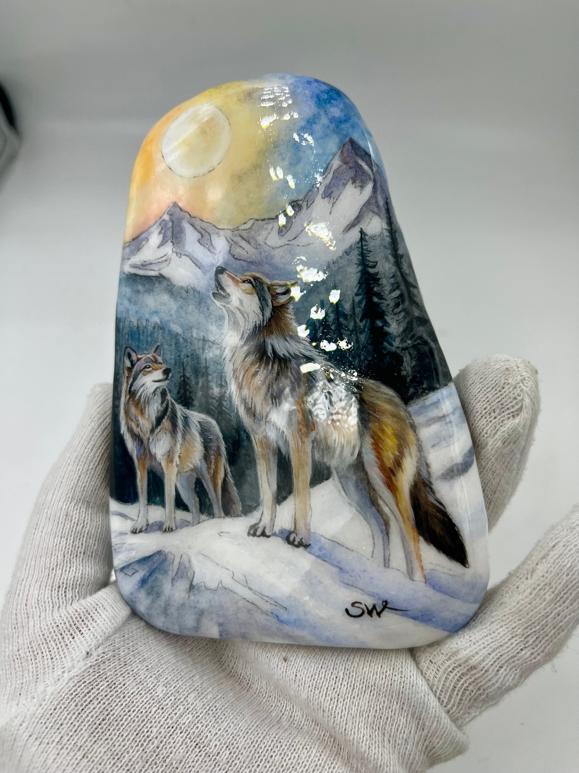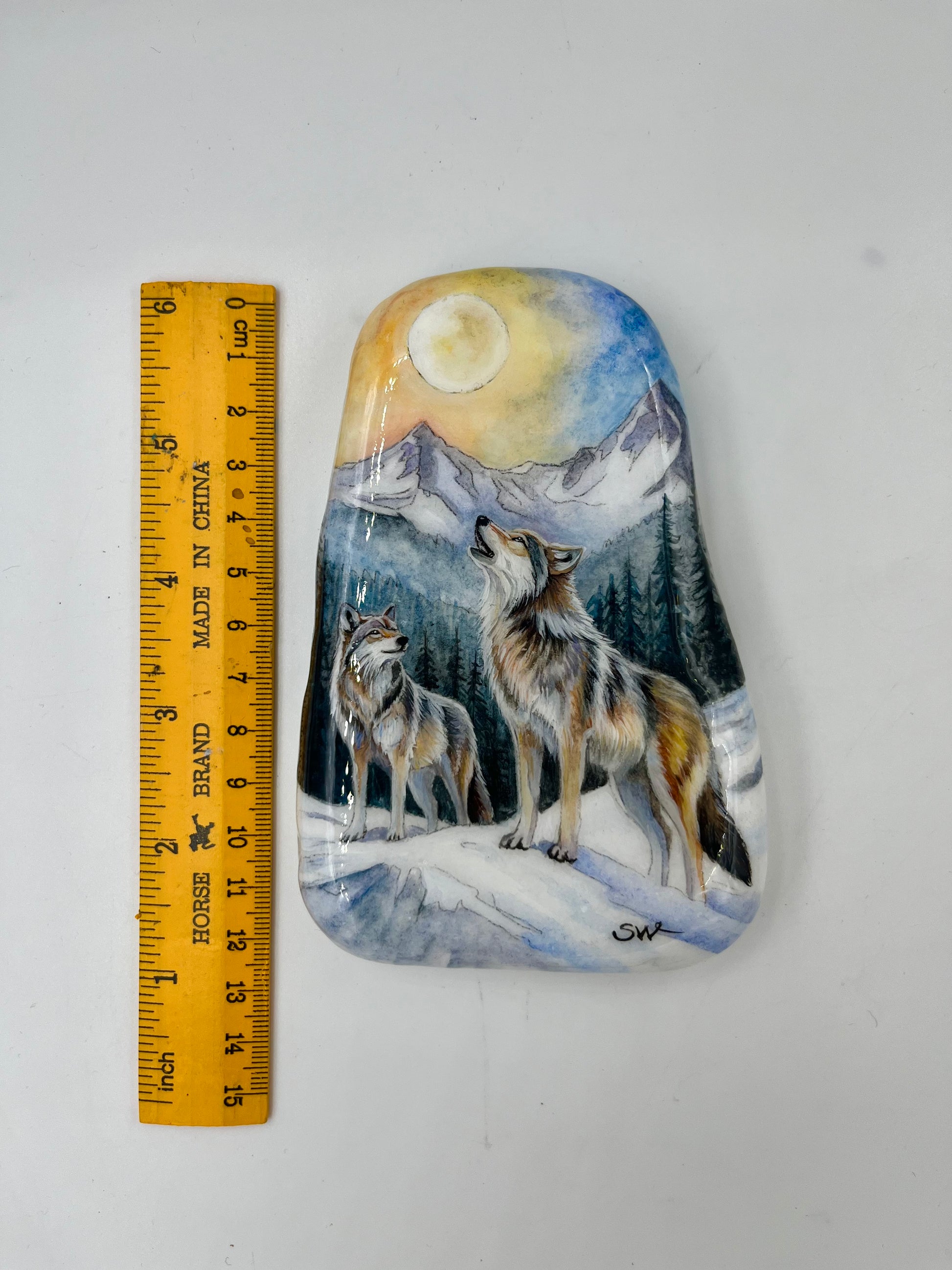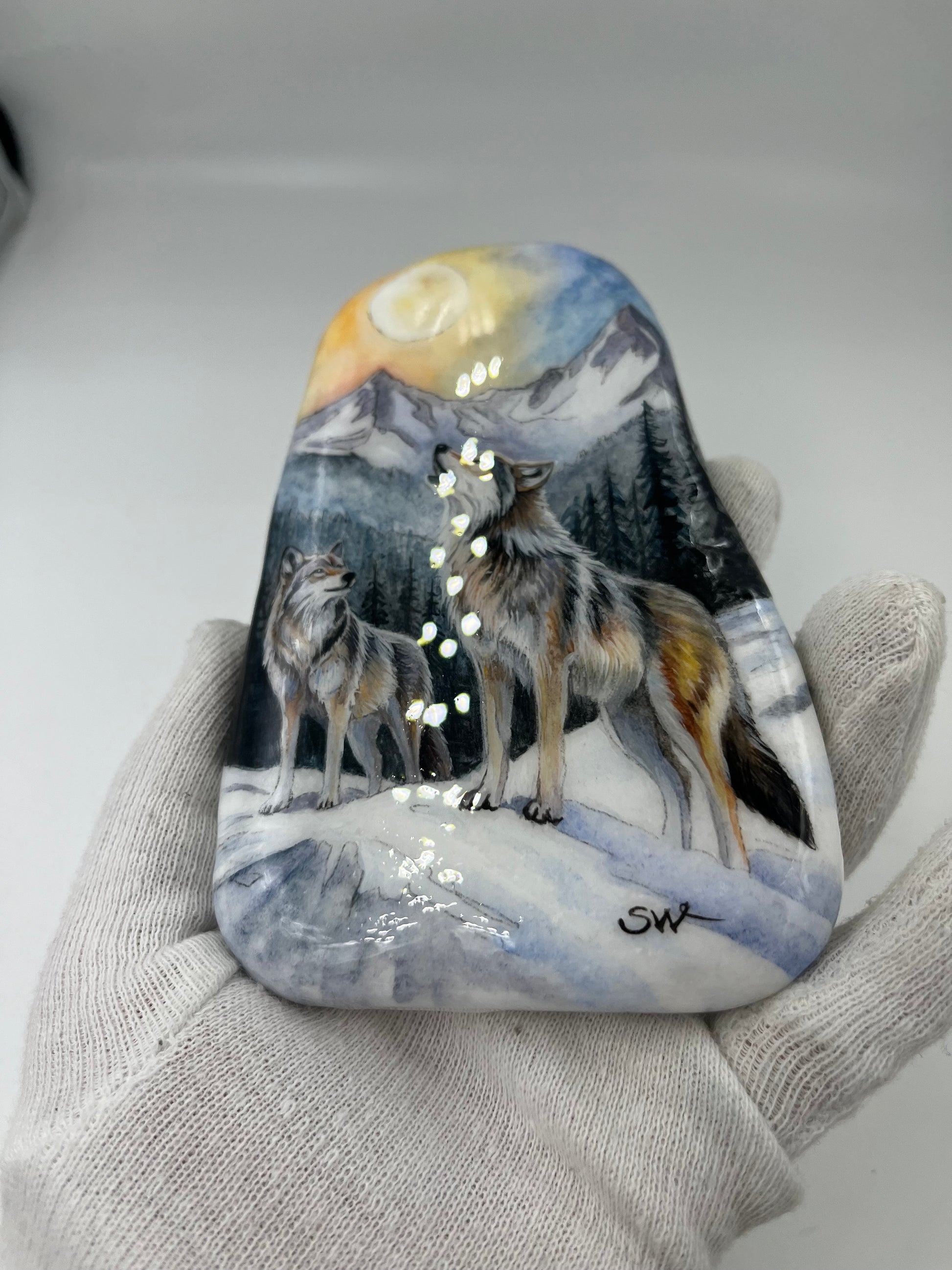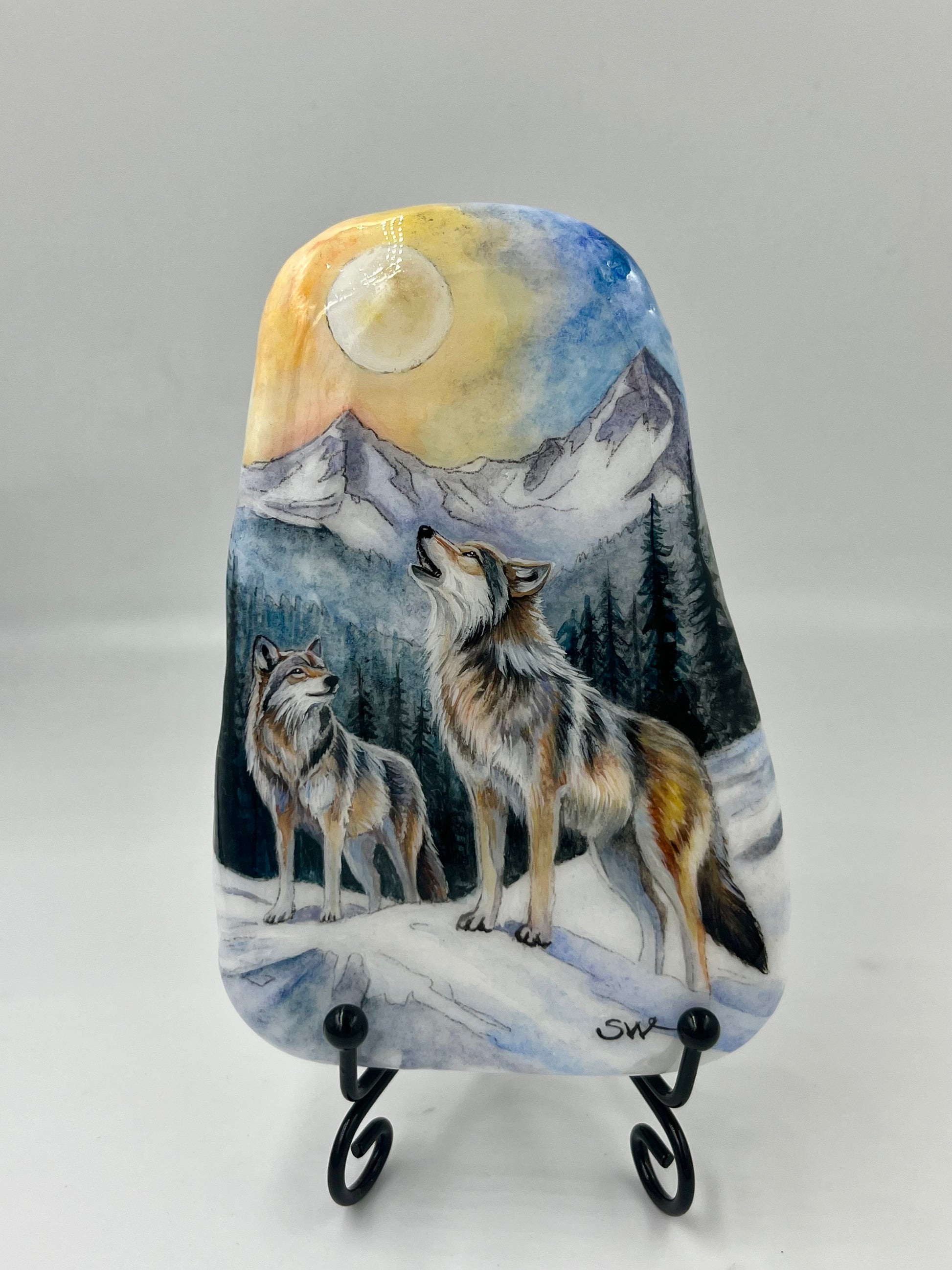 Einzigartig handbemalte Stein/Zwei Wölfe /inklusive Tischstaffelei