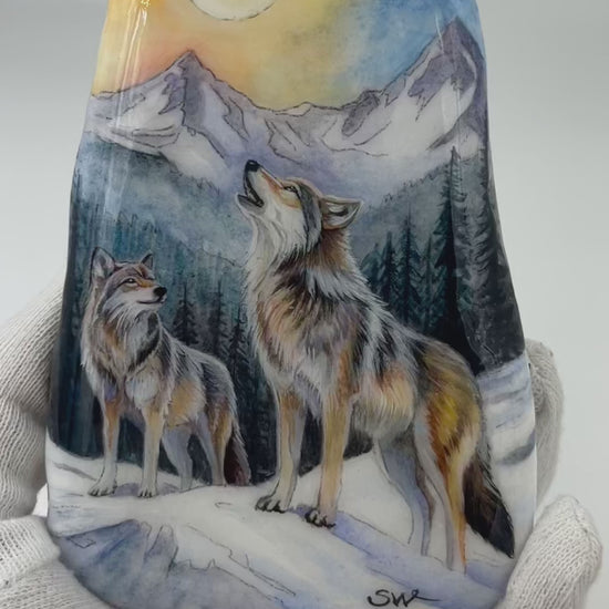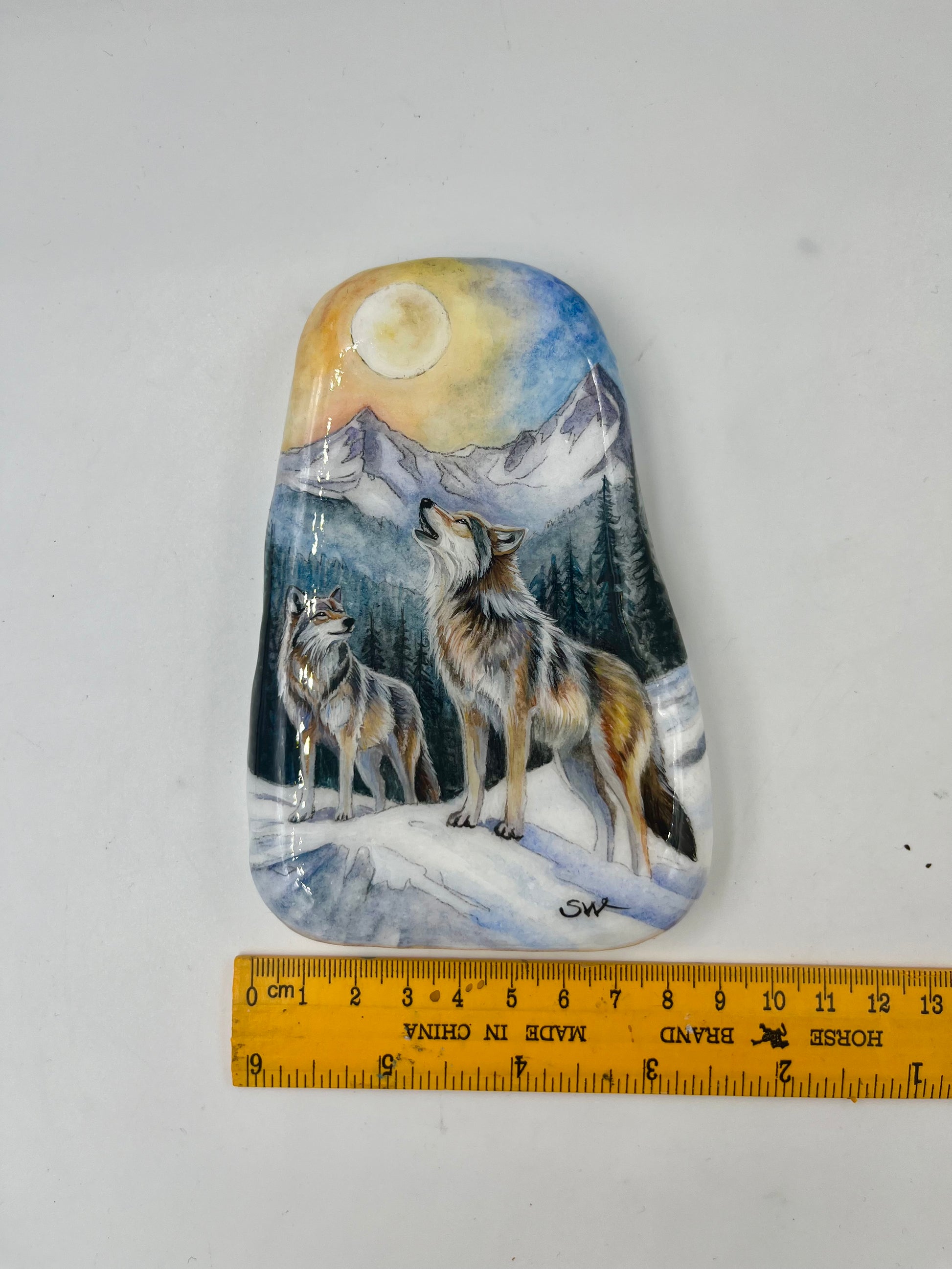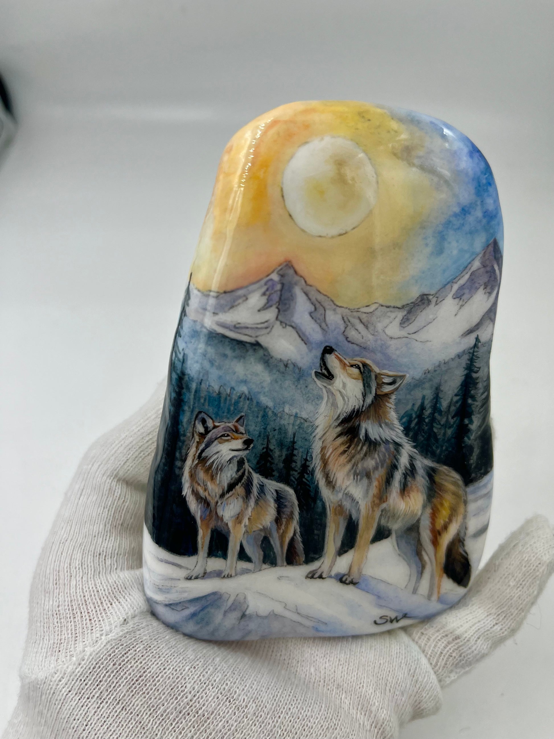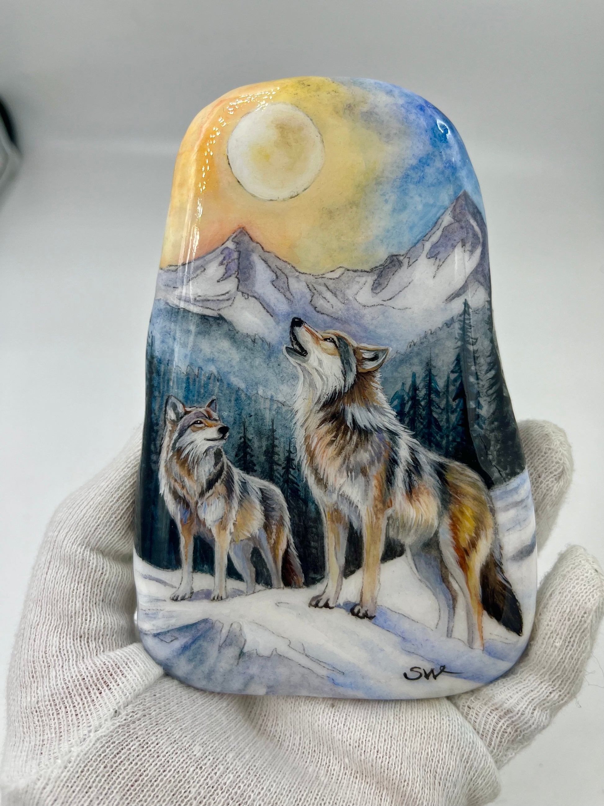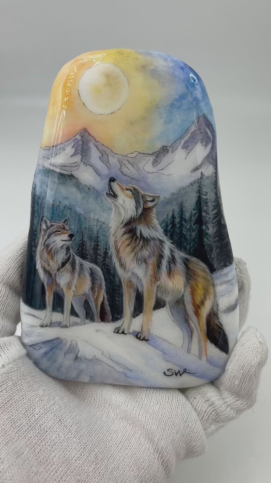Einzigartig handbemalte Stein/Zwei Wölfe /inklusive Tischstaffelei