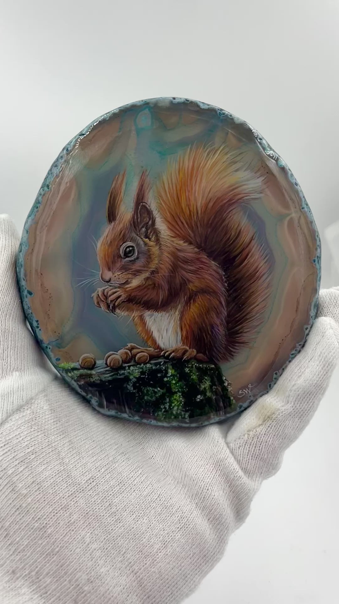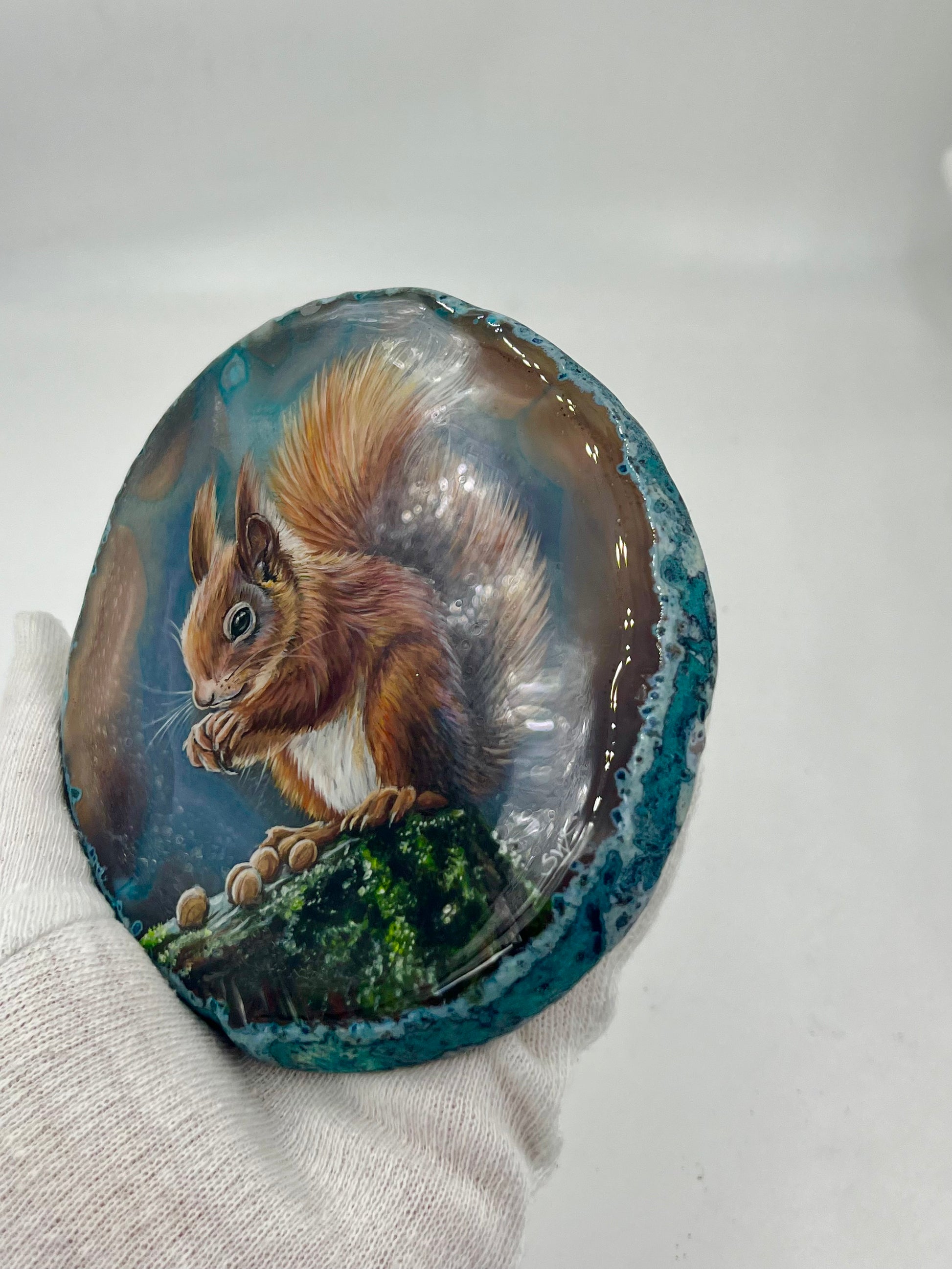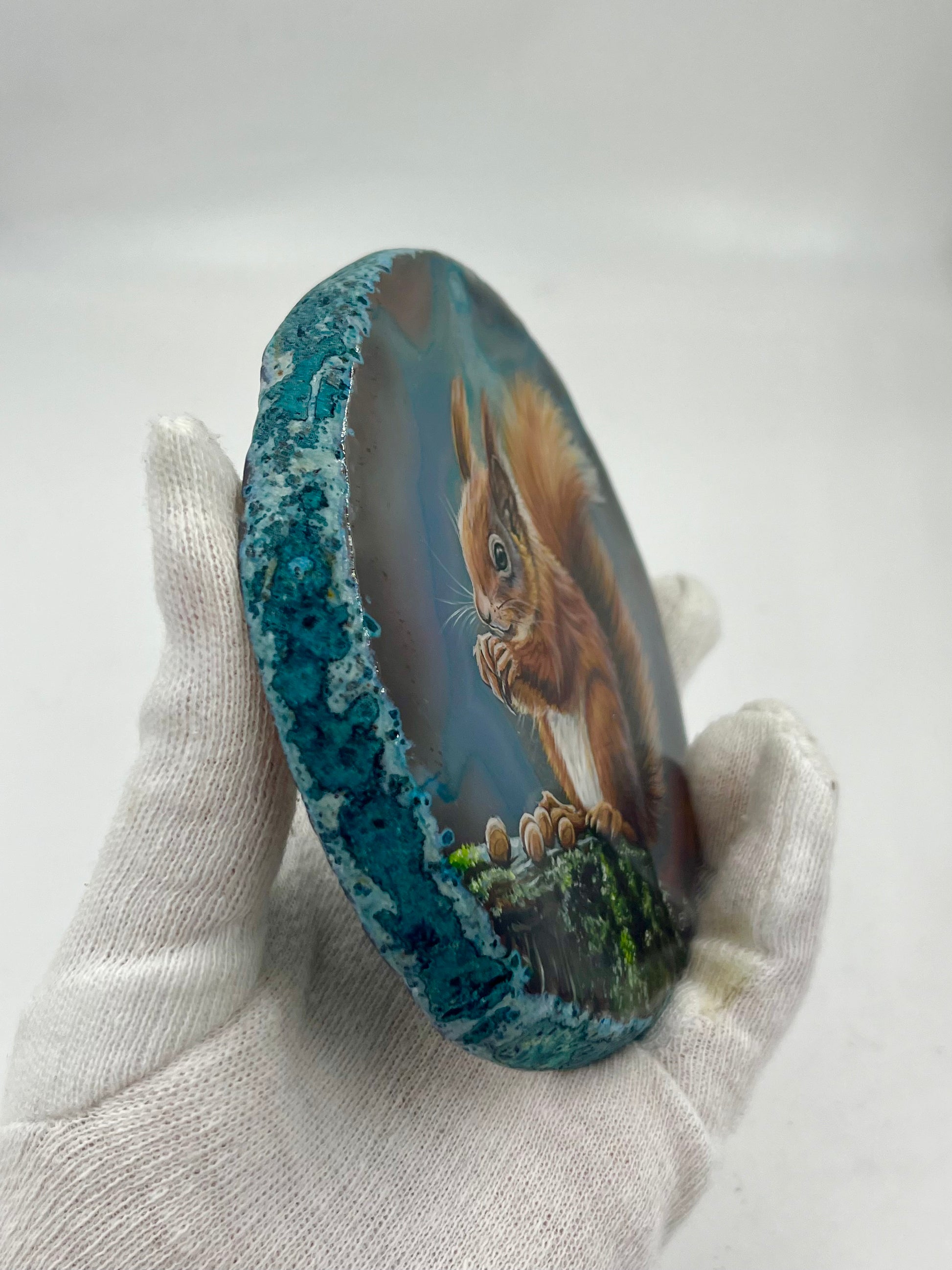 Einzigartige bemalt Achatscheibe/Das Eichhörnchen/Hand bemalt /Deko/Tierpotrait/ink.Metallständer