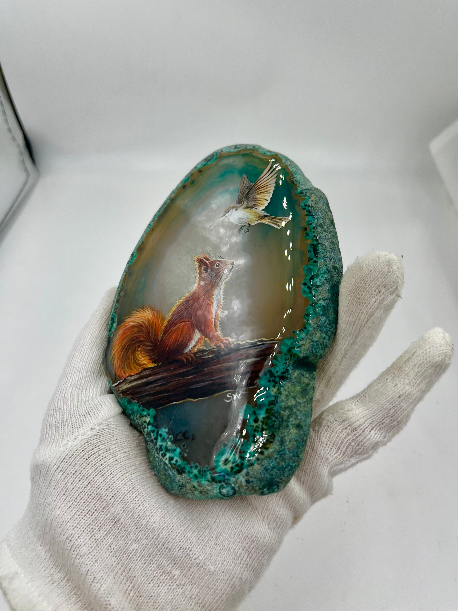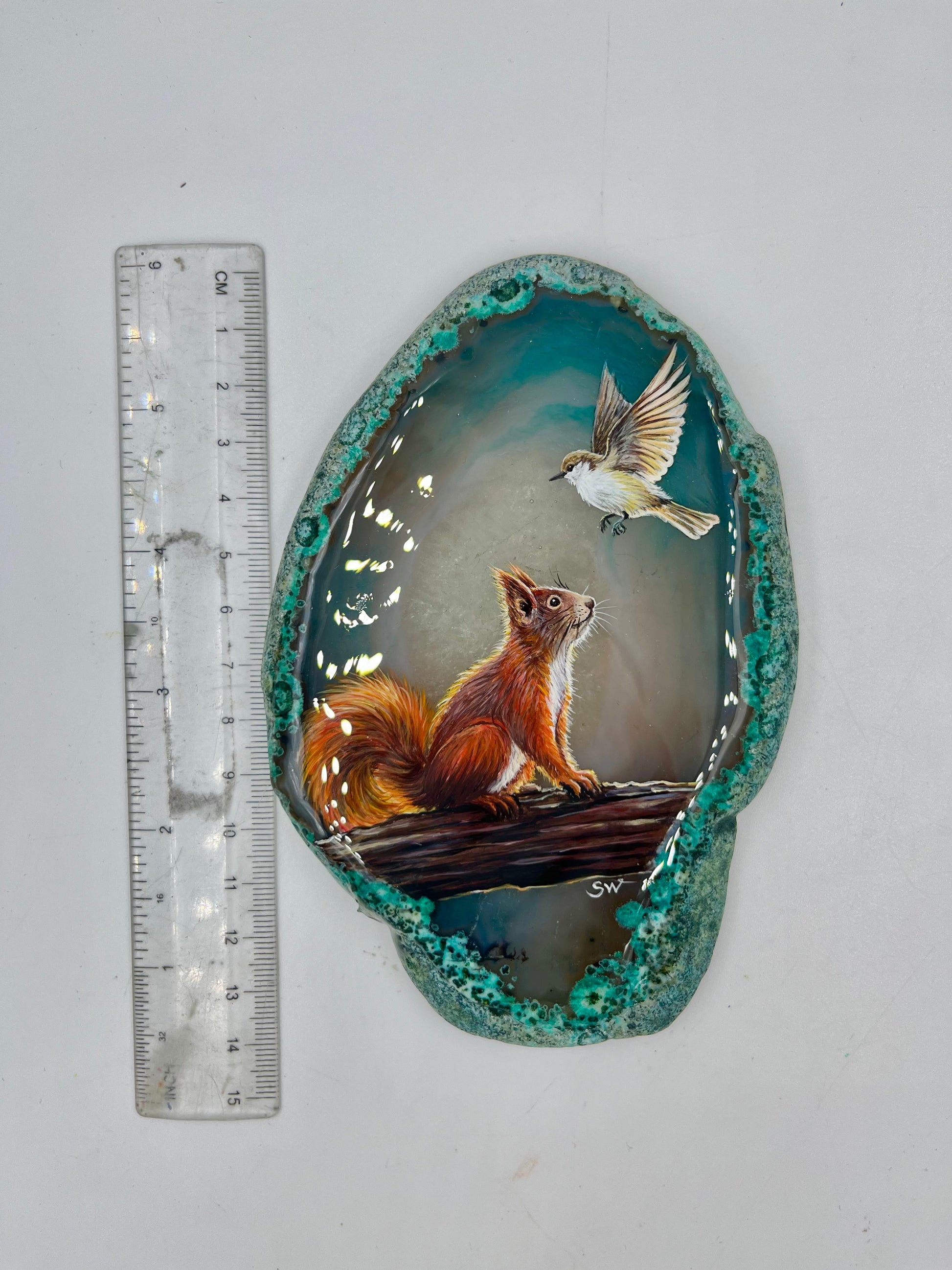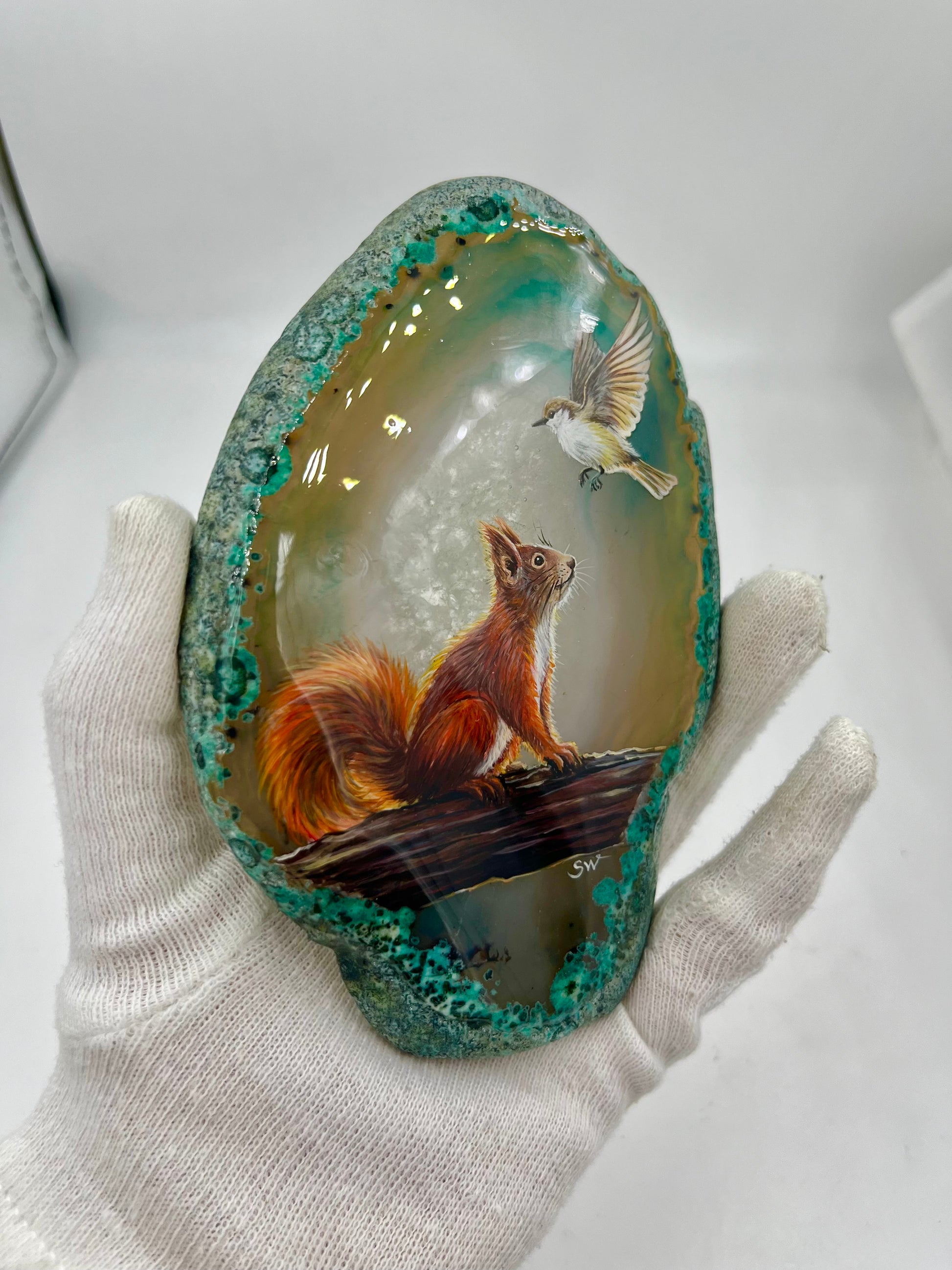 Einzigartige bemalt Achatscheibe/Das Eichhörnchen und der Vogel/Hand bemalt /Deko/Tierpotrait/ink.Metallständer