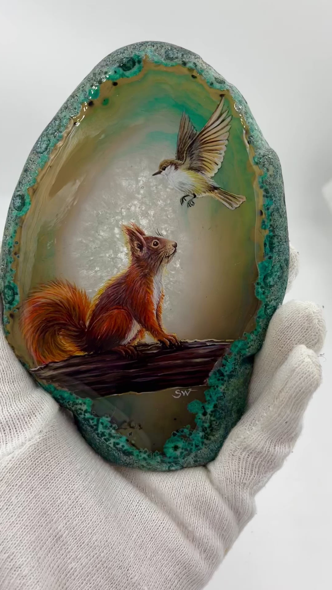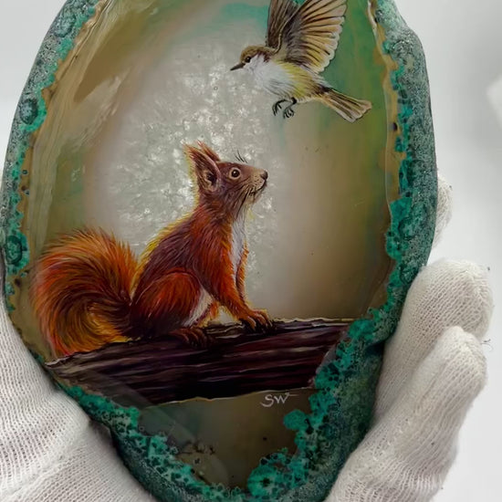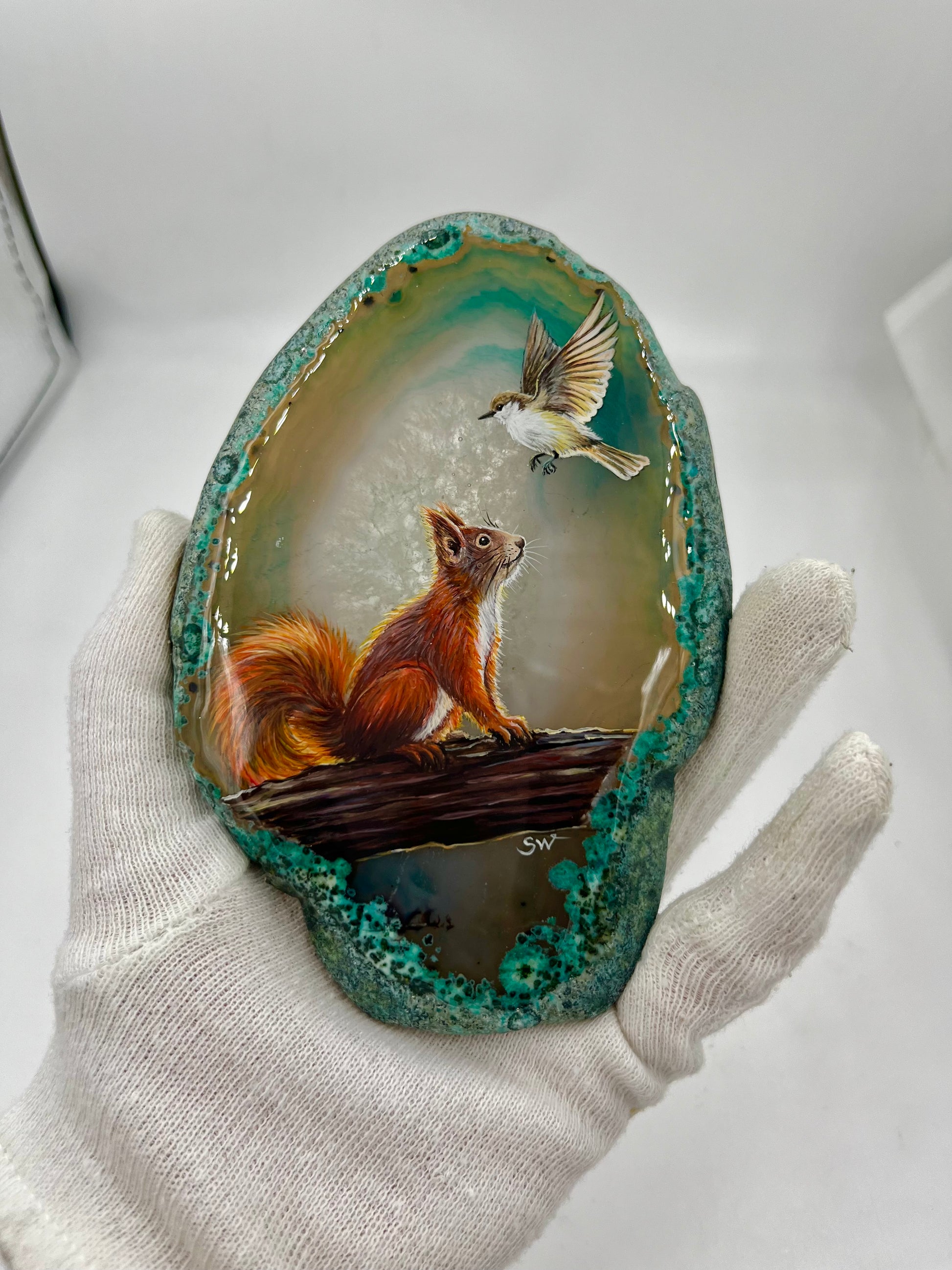 Einzigartige bemalt Achatscheibe/Das Eichhörnchen und der Vogel/Hand bemalt /Deko/Tierpotrait/ink.Metallständer