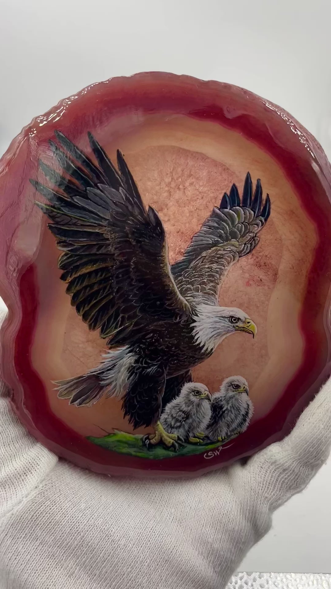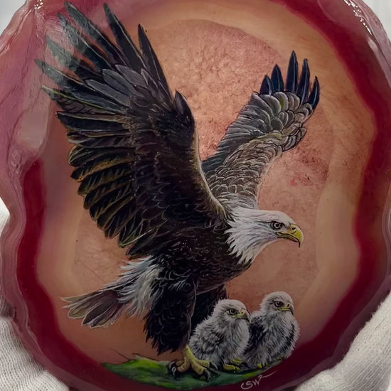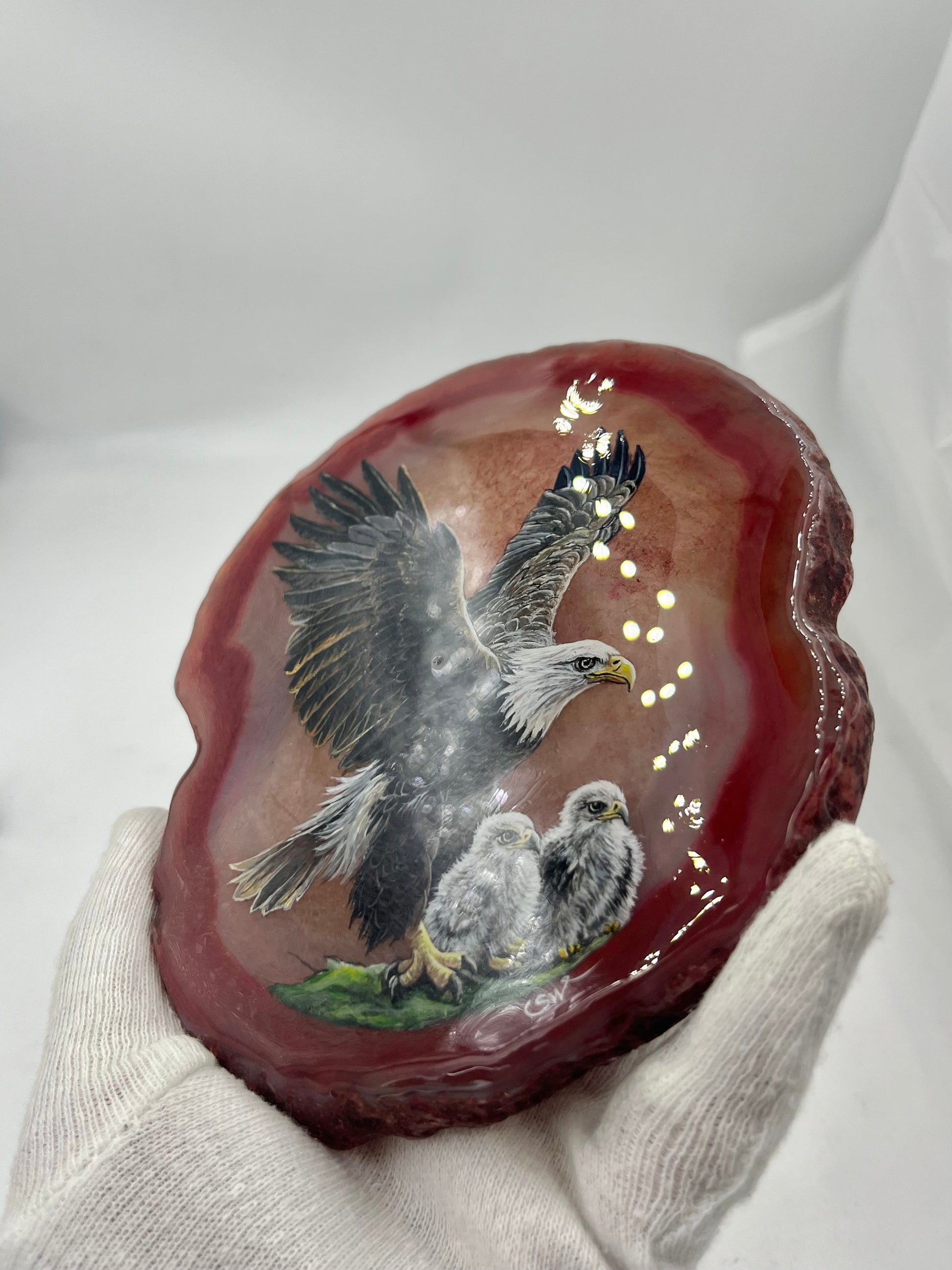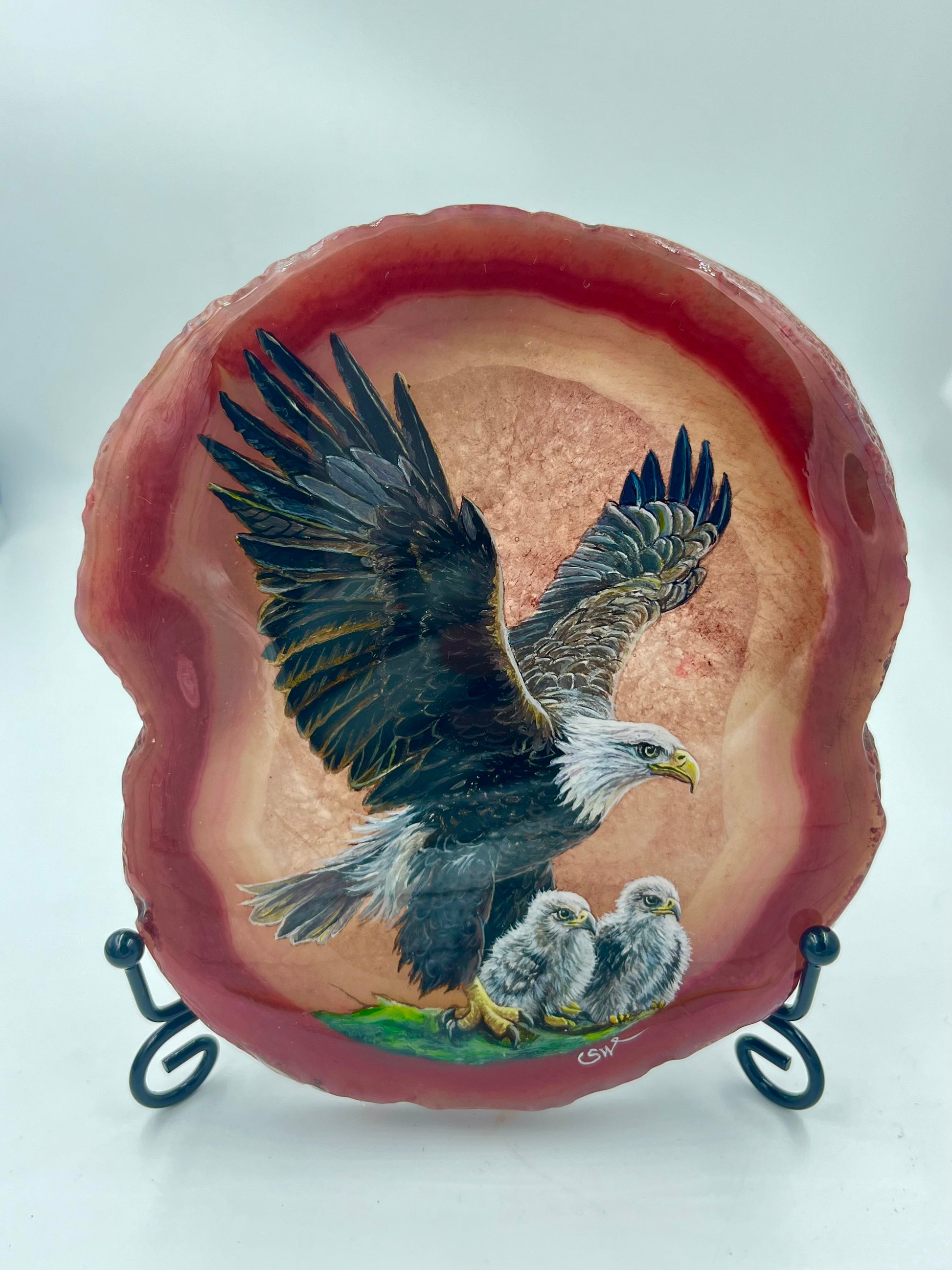 Einzigartige bemalt Achatscheibe/Der Adler und seine zwei Kinder/Hand bemalt /Deko/Tierpotrait/ink.Metallständer