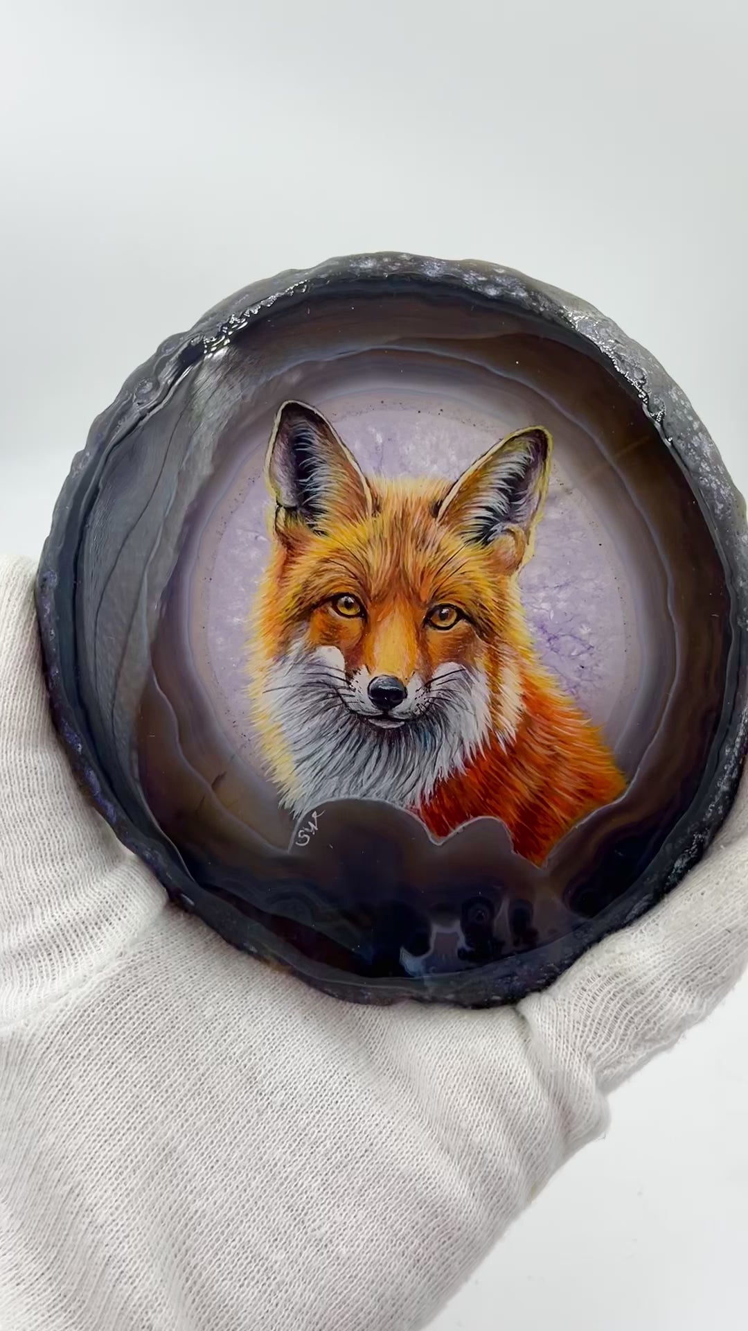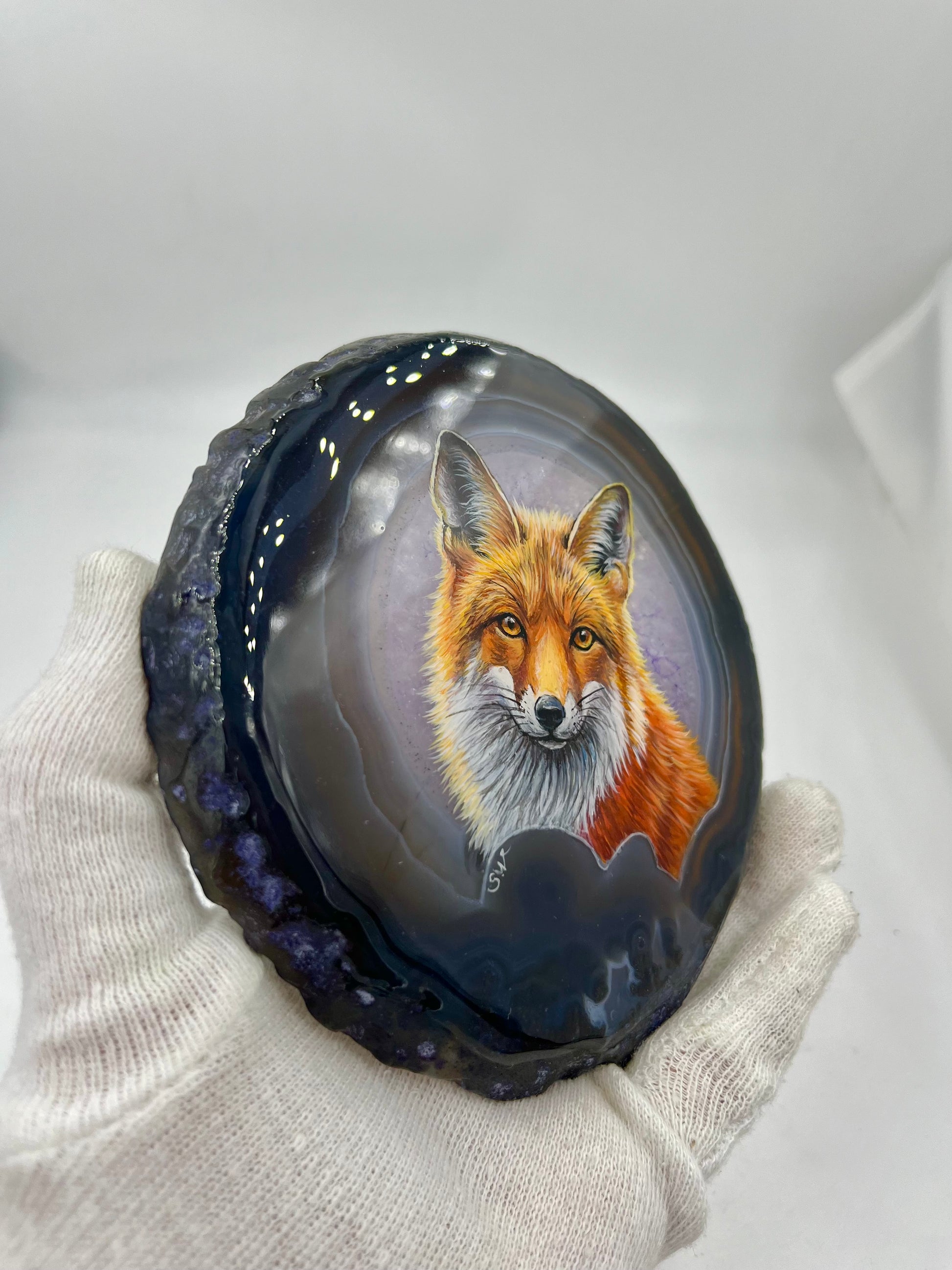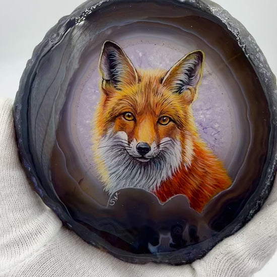 Einzigartige bemalt Achatscheibe/Der Fuchs /Hand bemalt /Deko/Tierpotrait/ink.Metallständer
