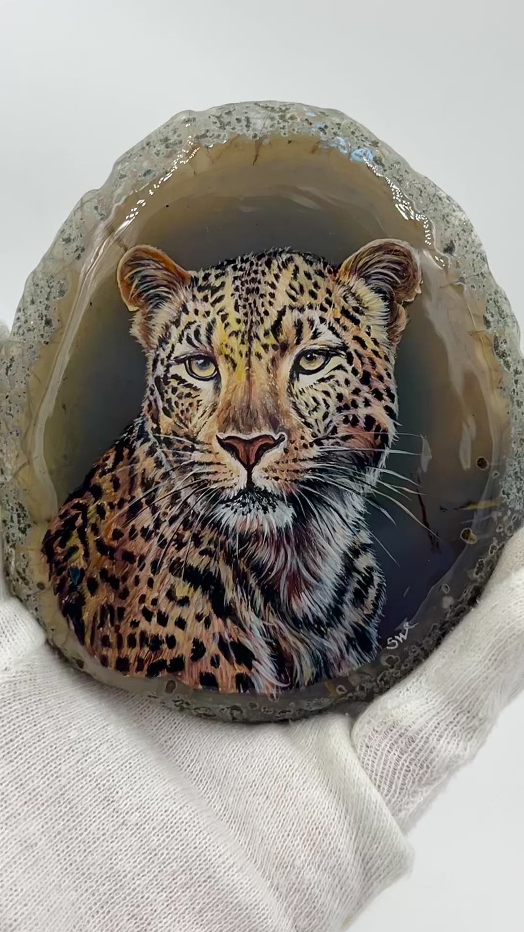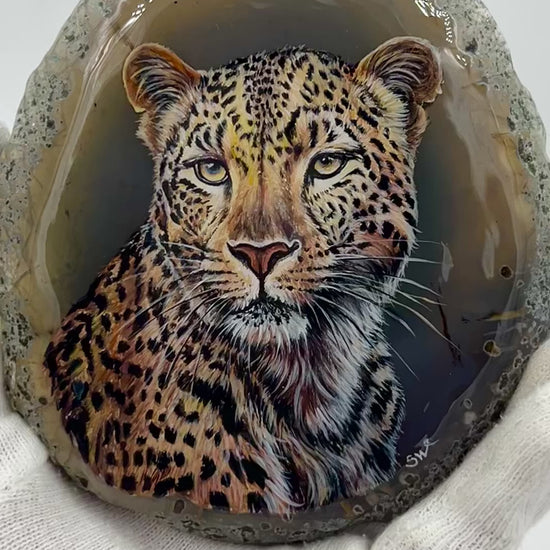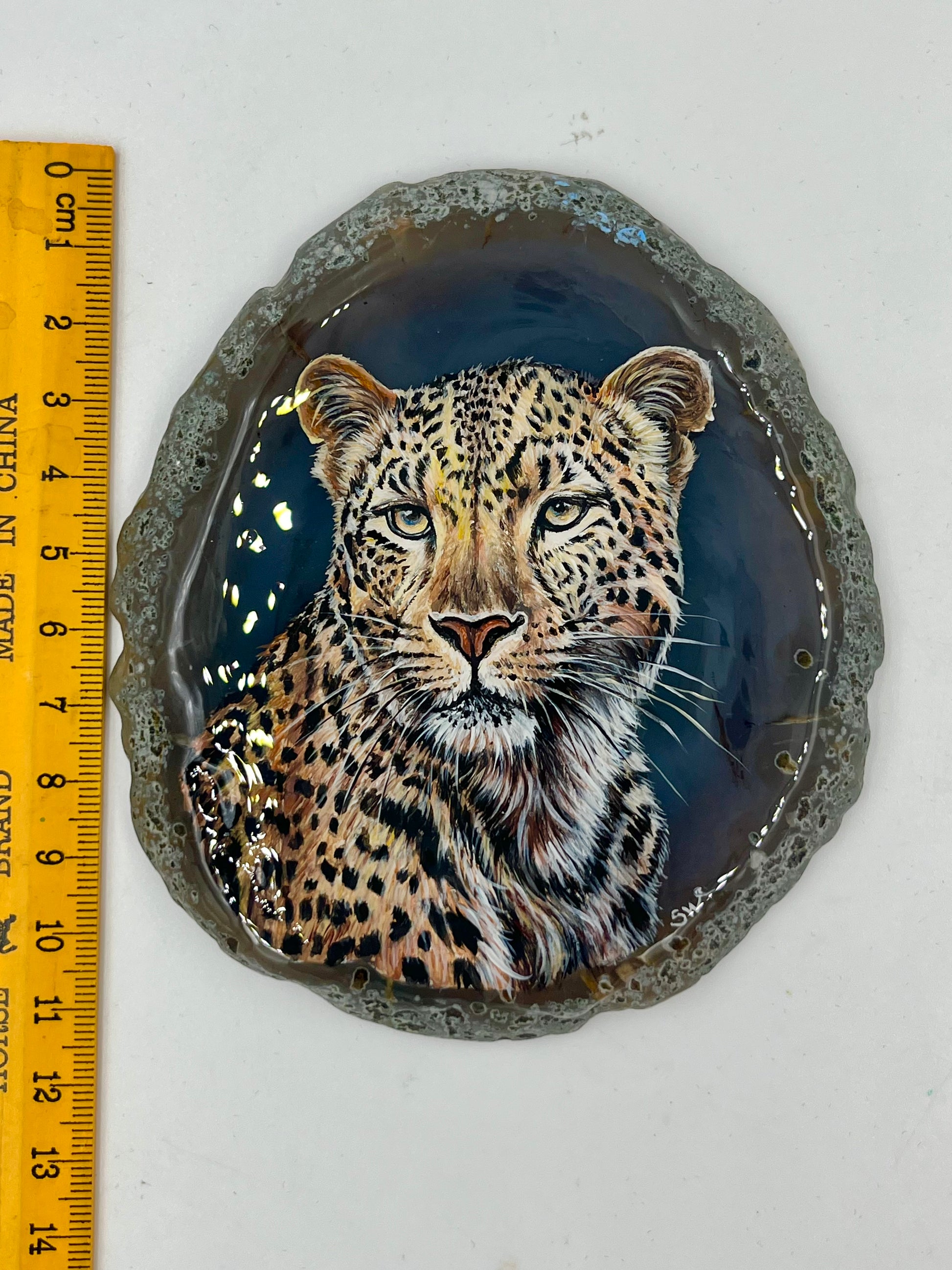 Einzigartige bemalt Achatscheibe/Der Leopard /Hand bemalt /Deko/Tierpotrait/ink.Metallständer