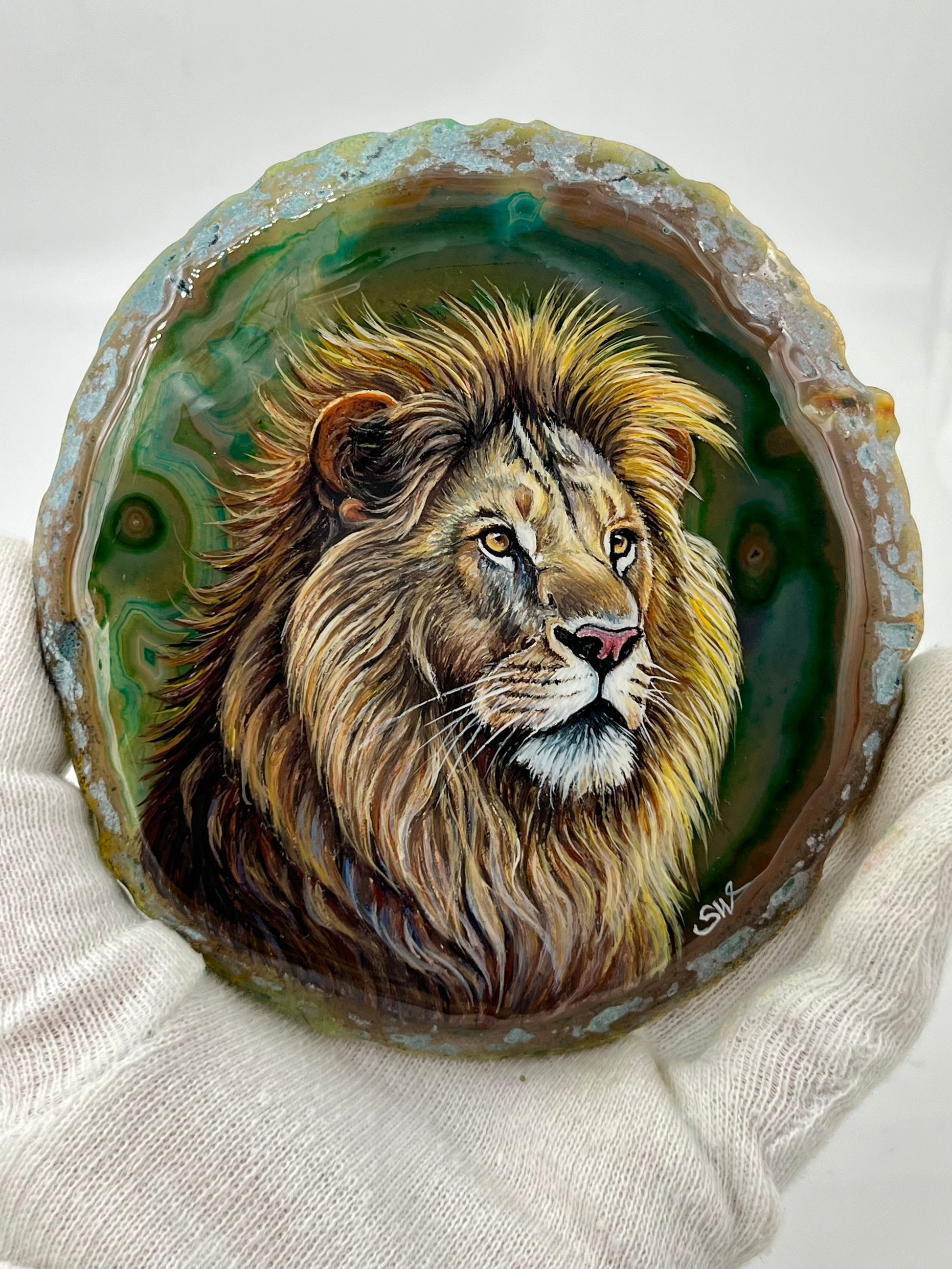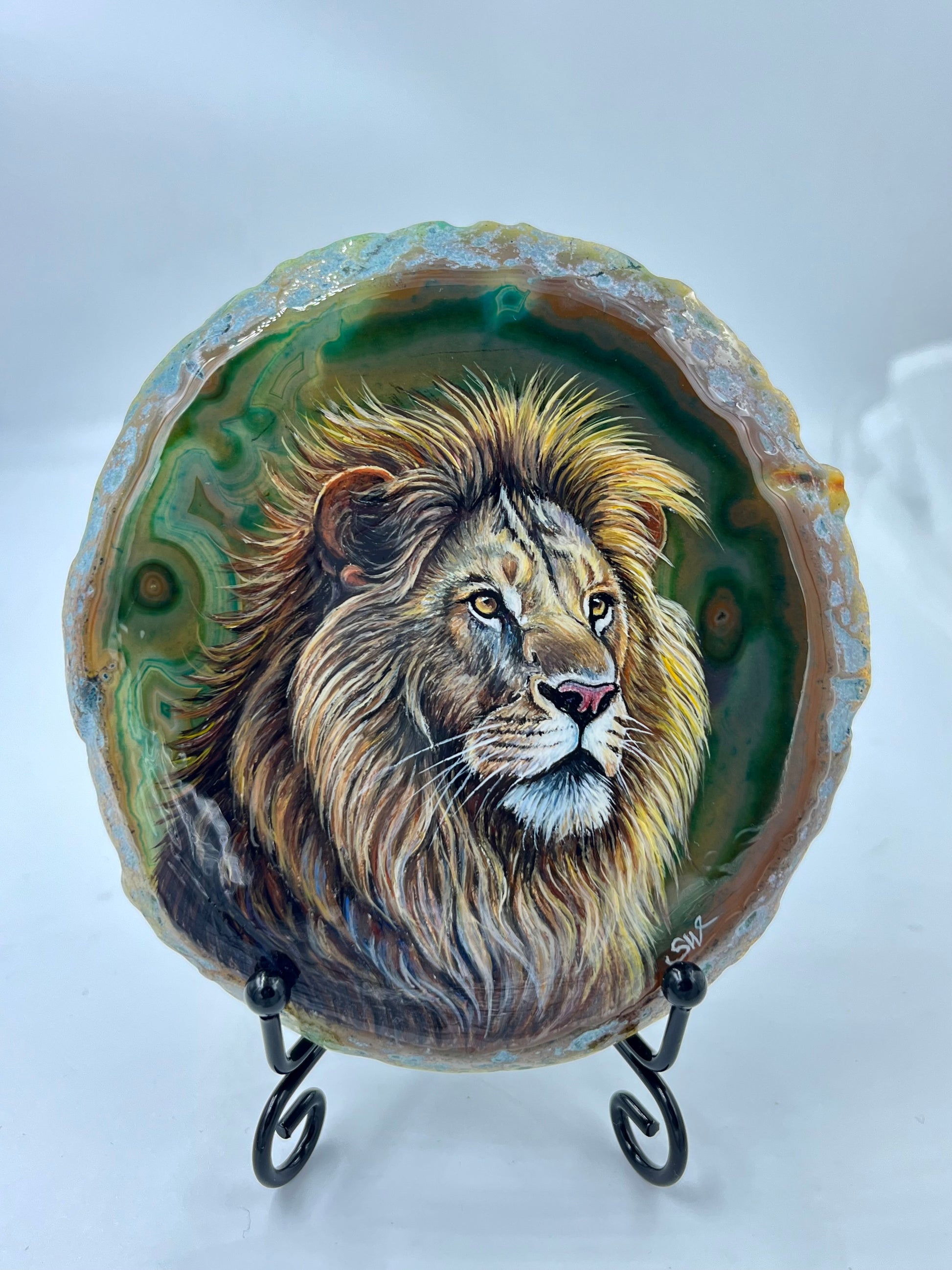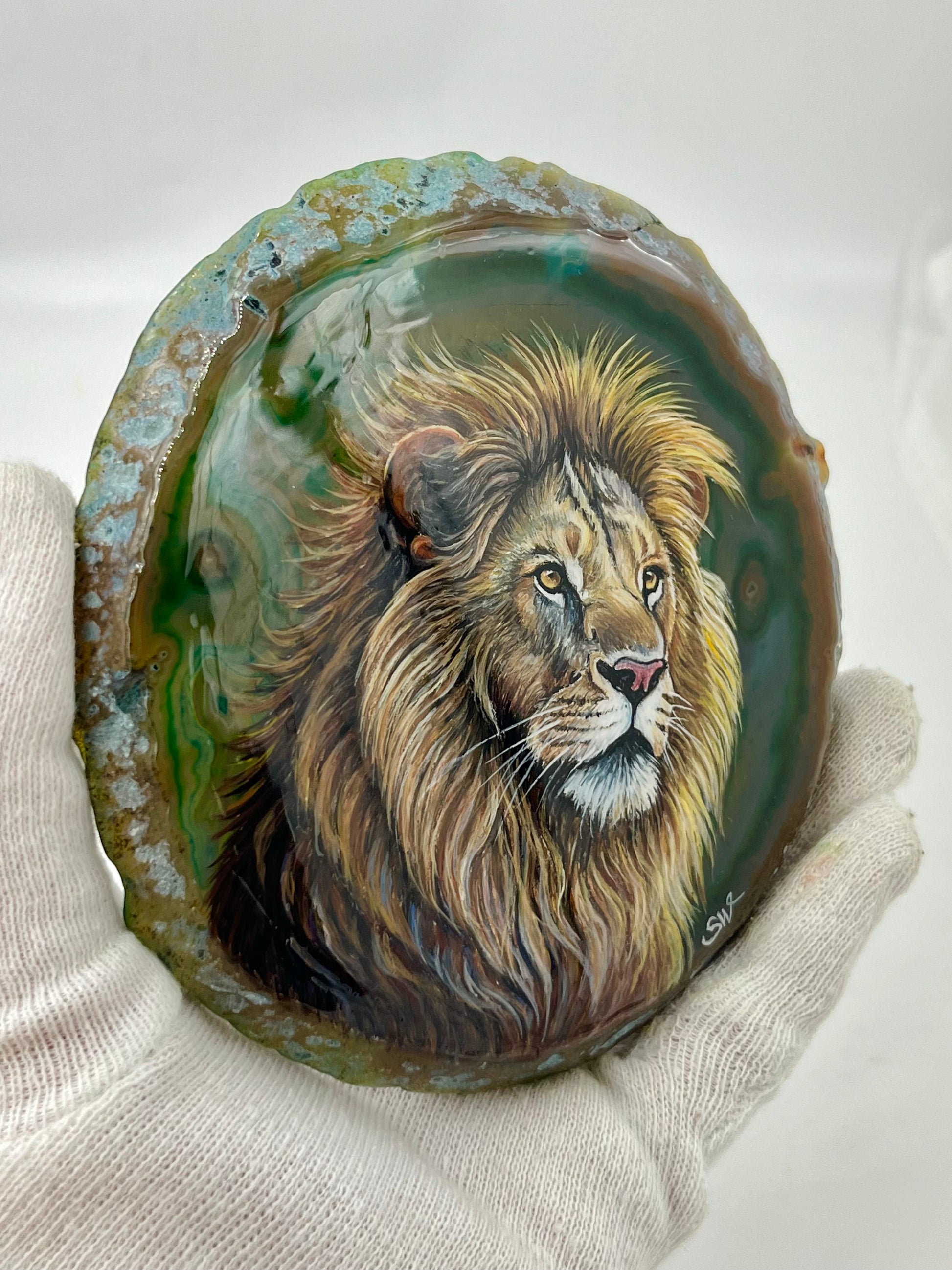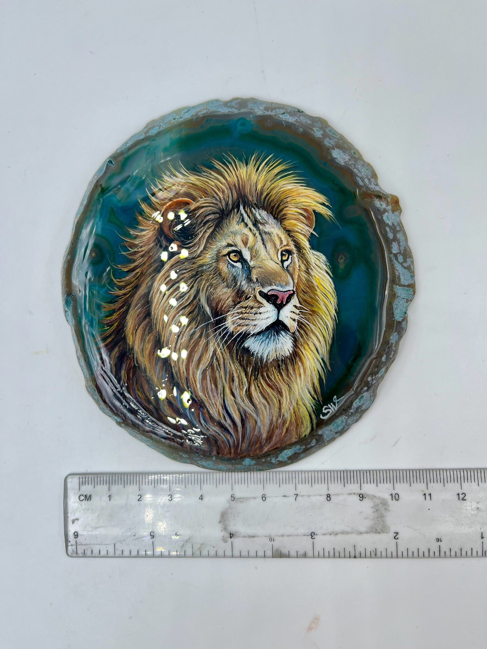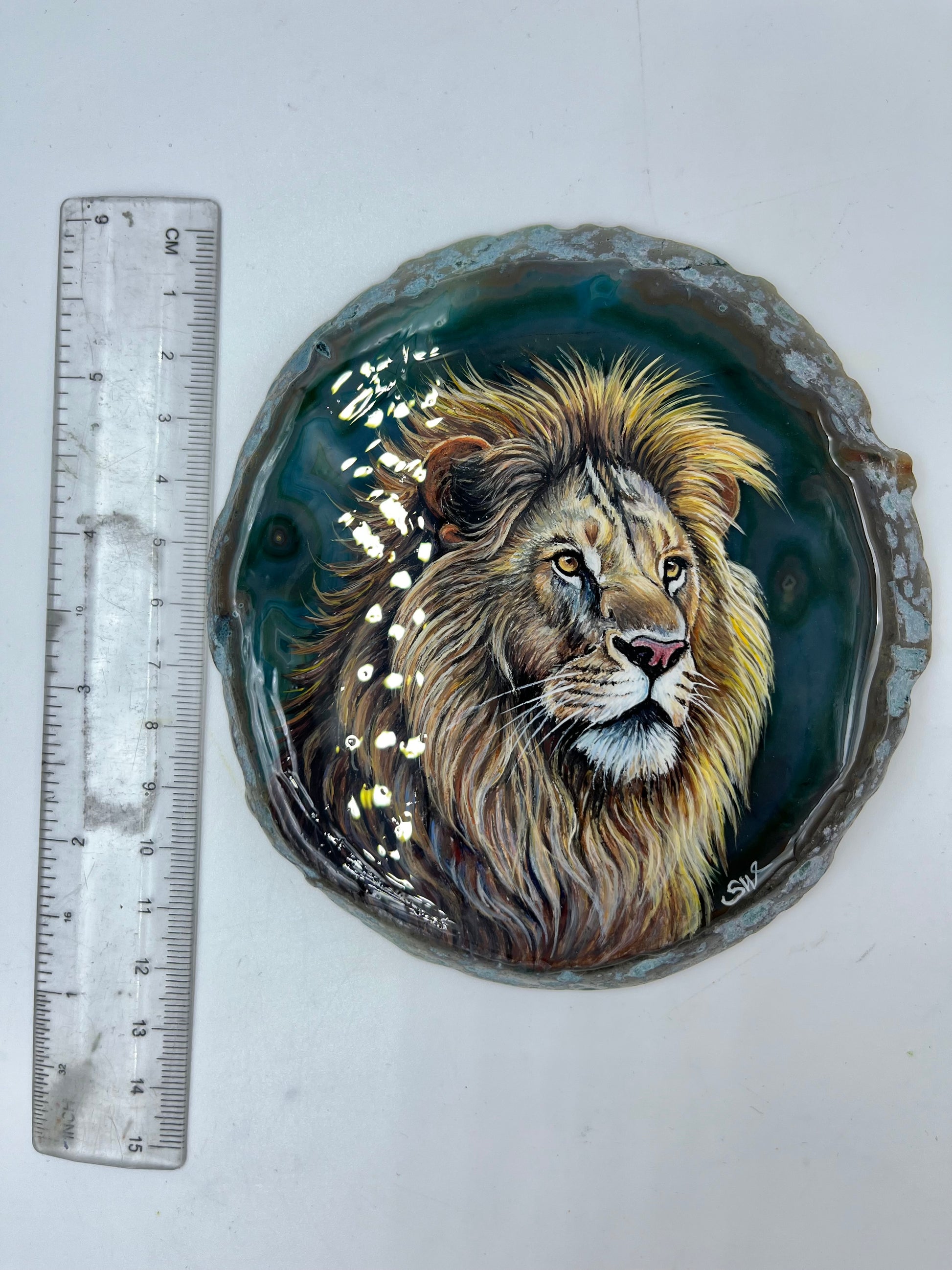 Einzigartige bemalt Achatscheibe/Der Löwe/Hand bemalt /Deko/Tierpotrait/ink.Metallständer