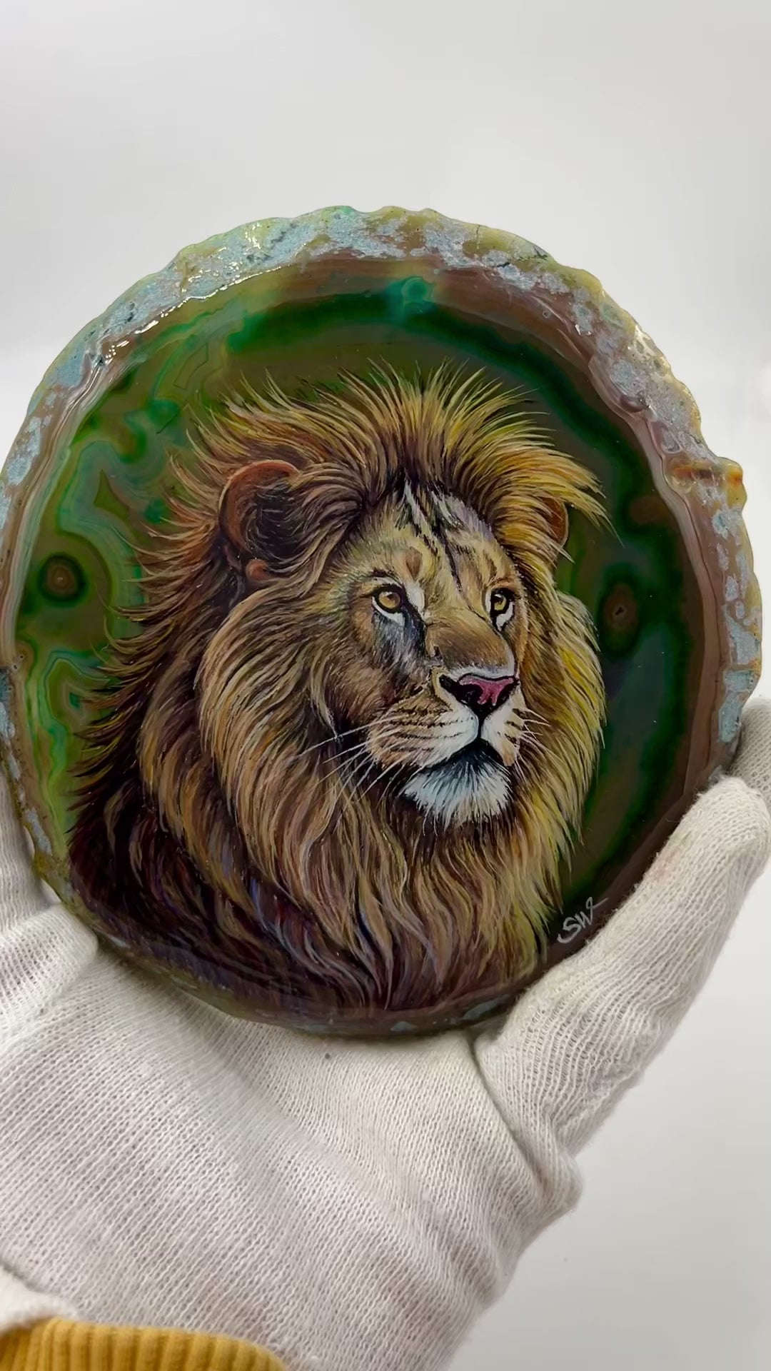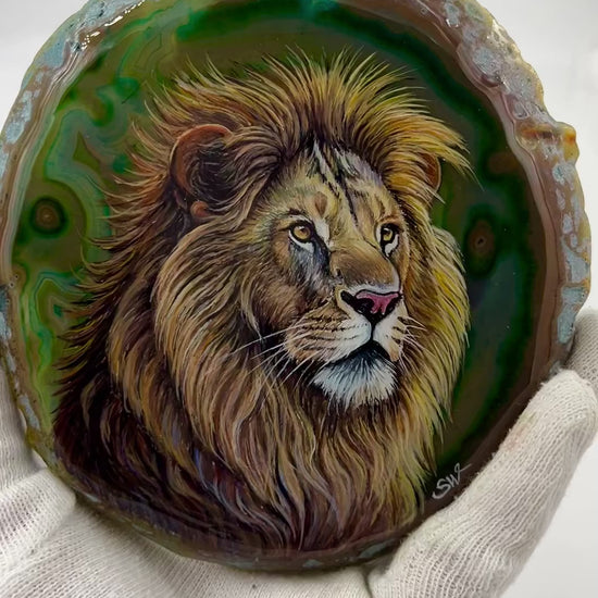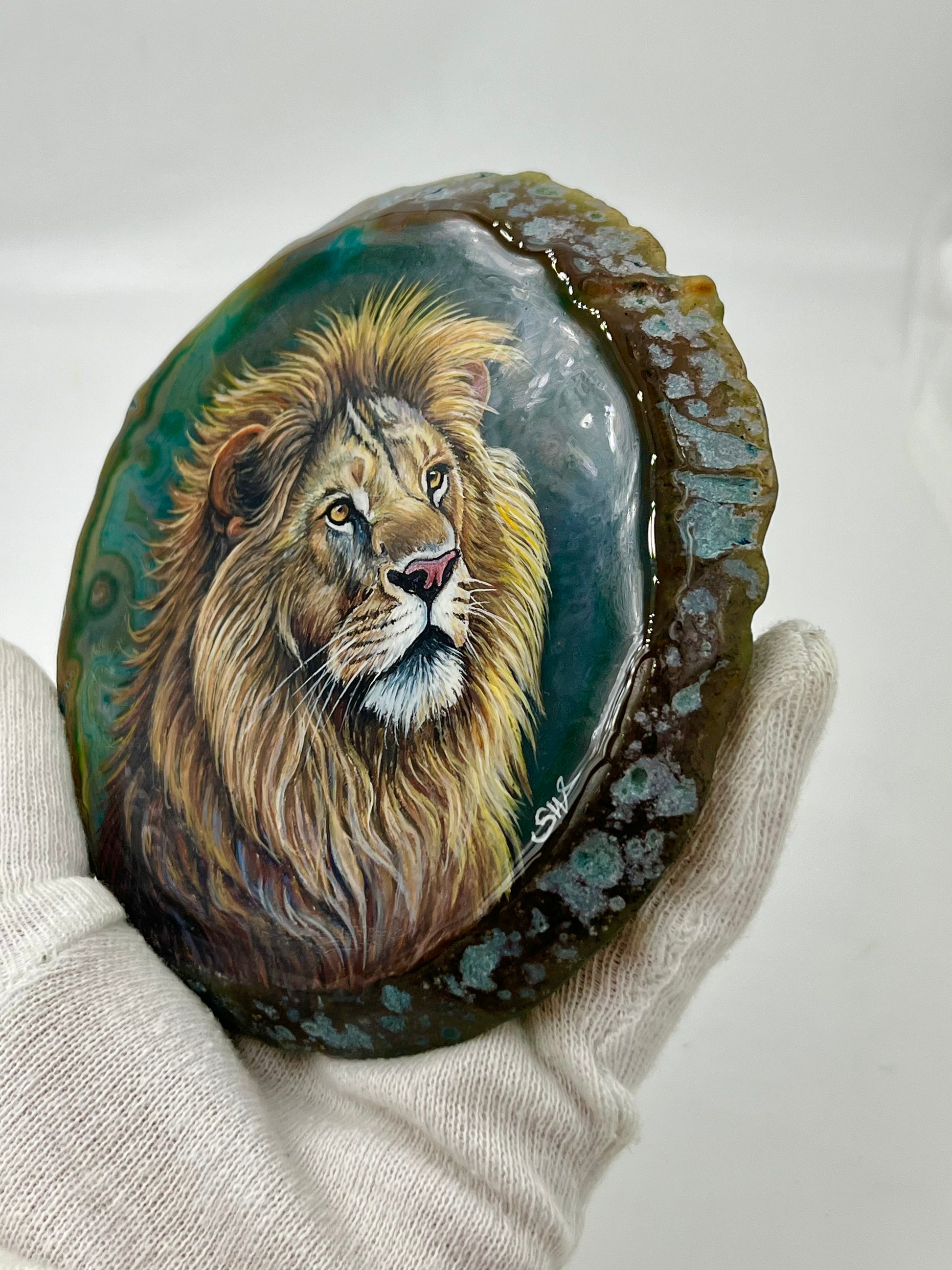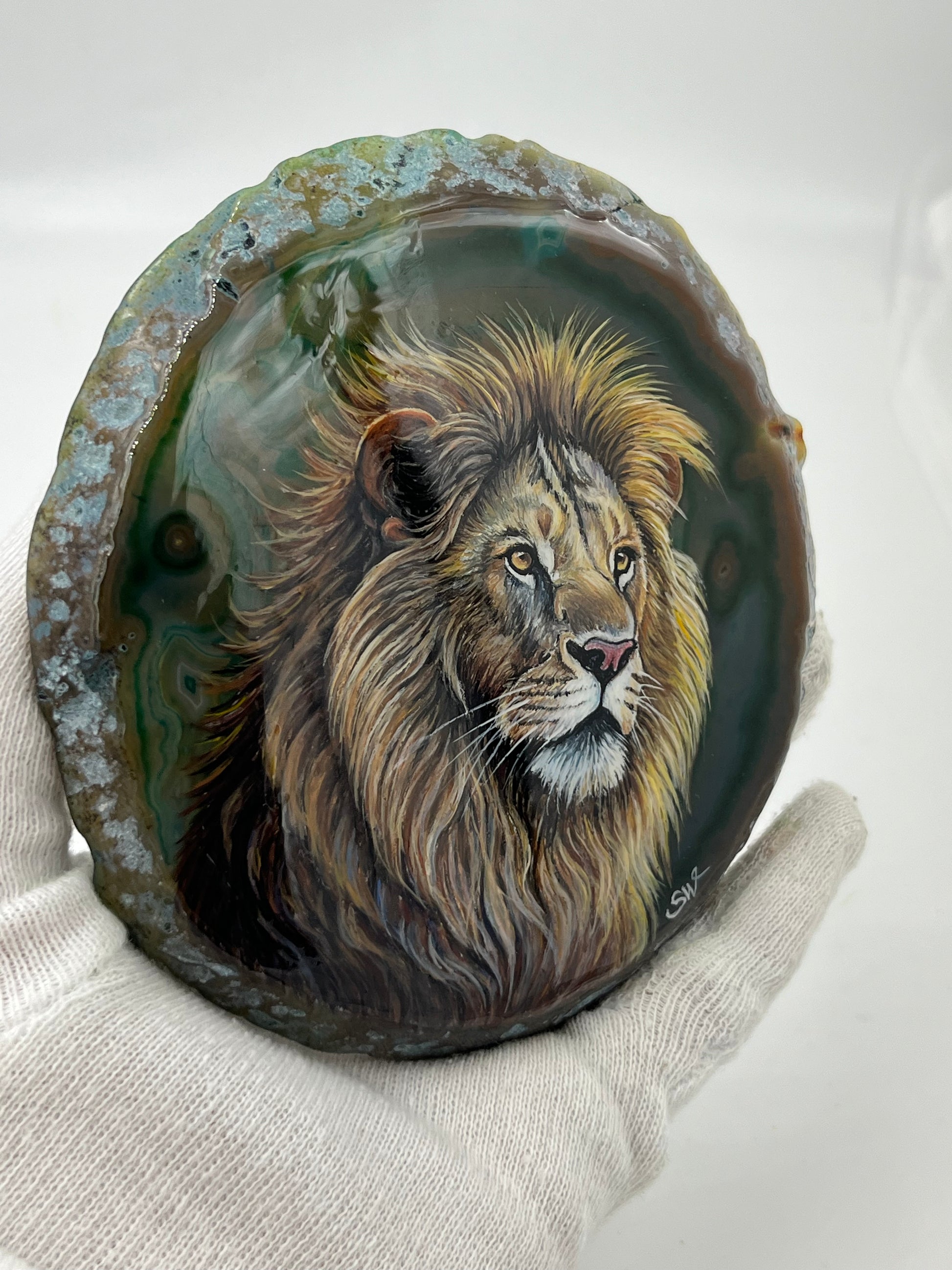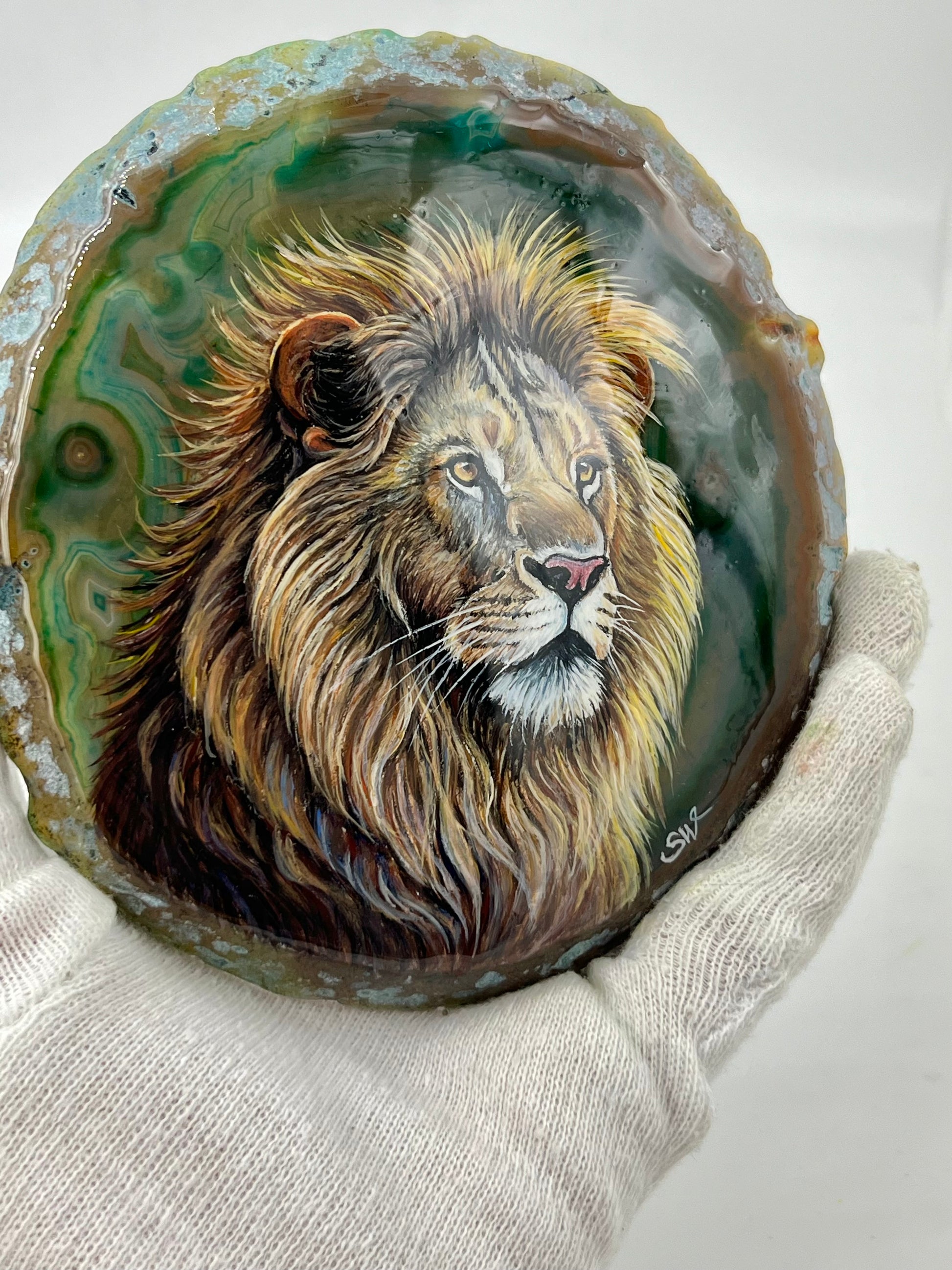 Einzigartige bemalt Achatscheibe/Der Löwe/Hand bemalt /Deko/Tierpotrait/ink.Metallständer