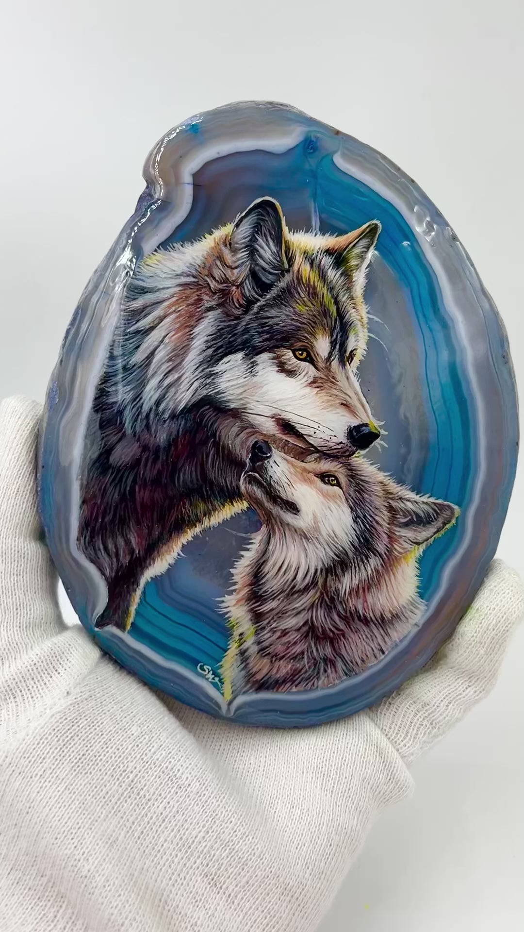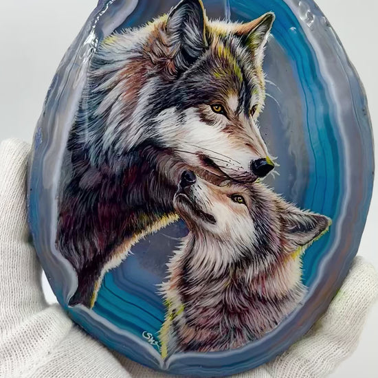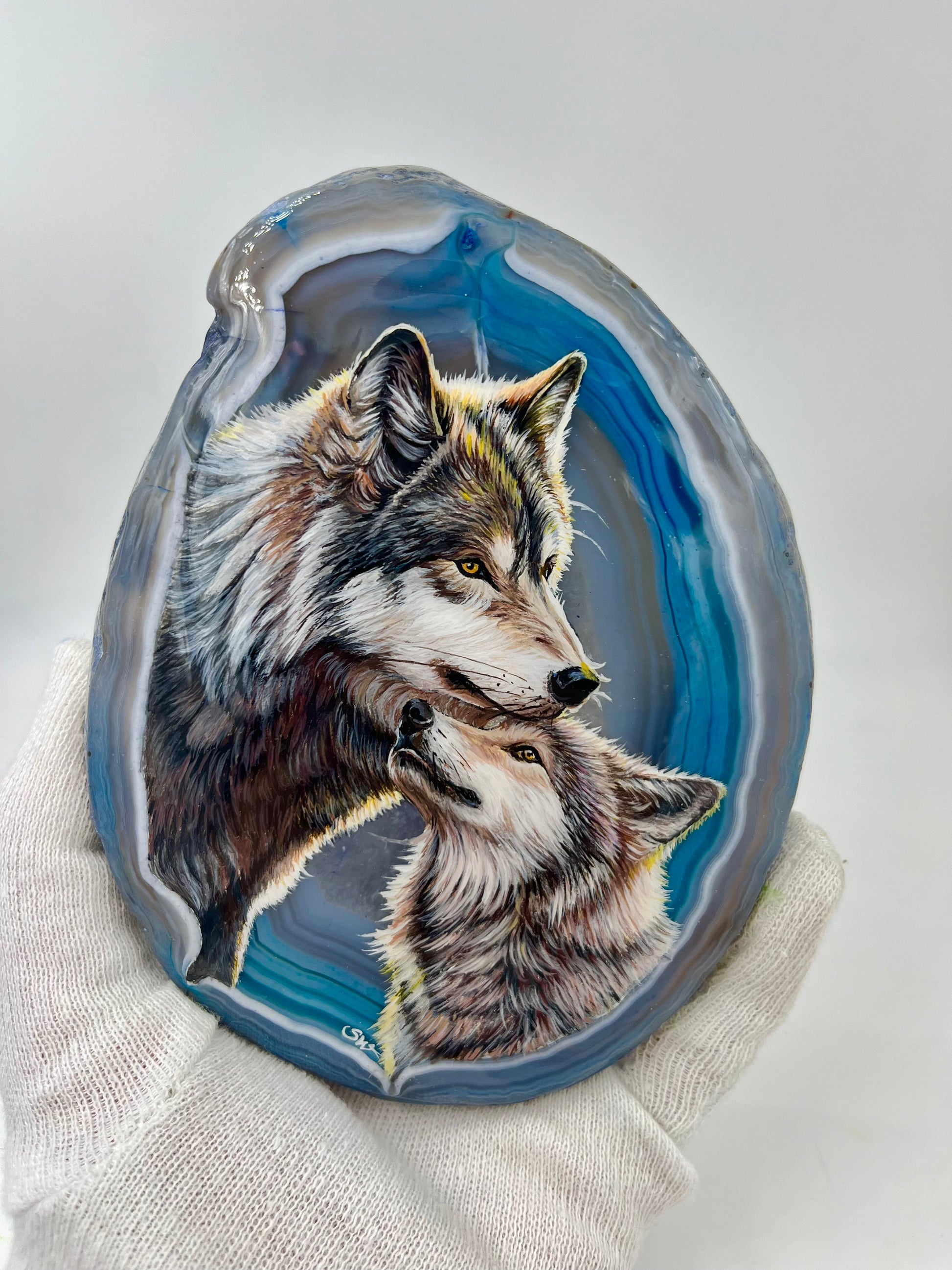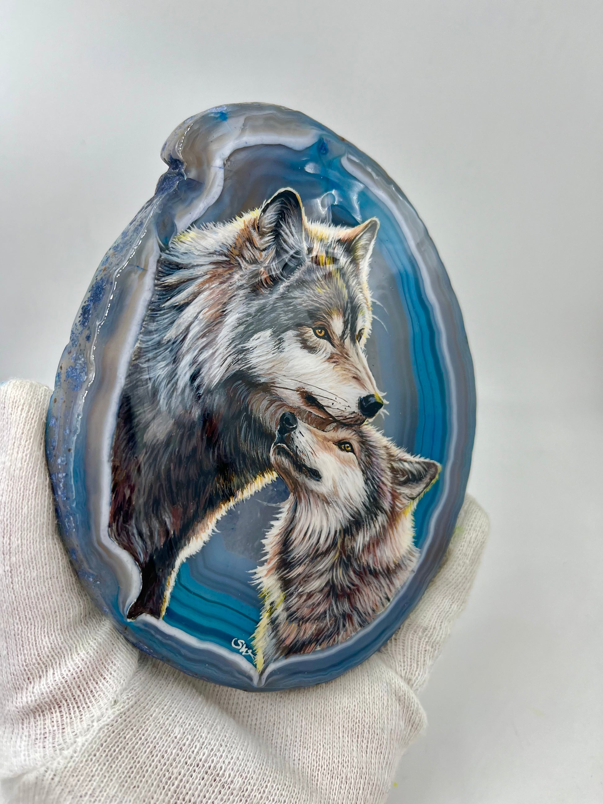 Einzigartige bemalt Achatscheibe/Die Wolfsmutter und ihr Junges/Hand bemalt /Deko/Tierpotrait/ink.Metallständer
