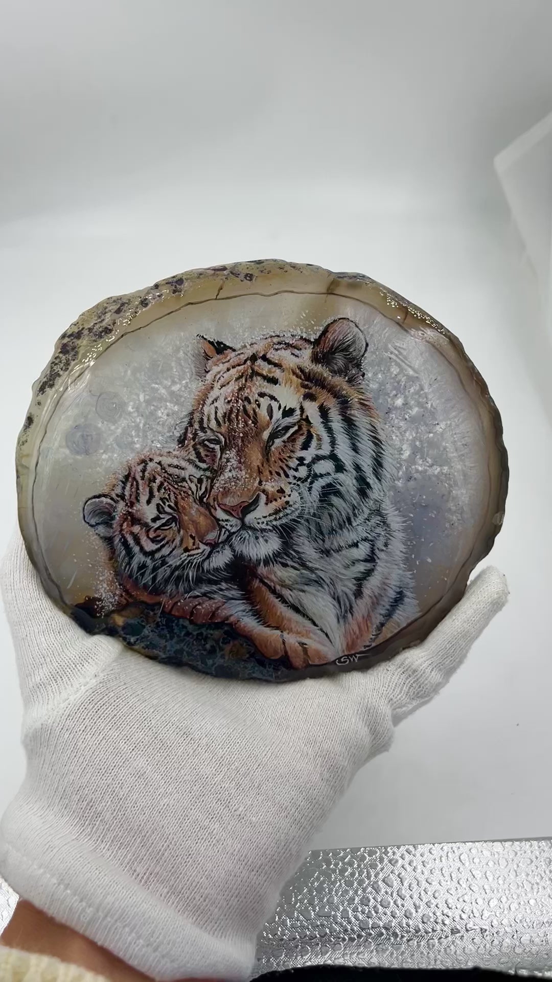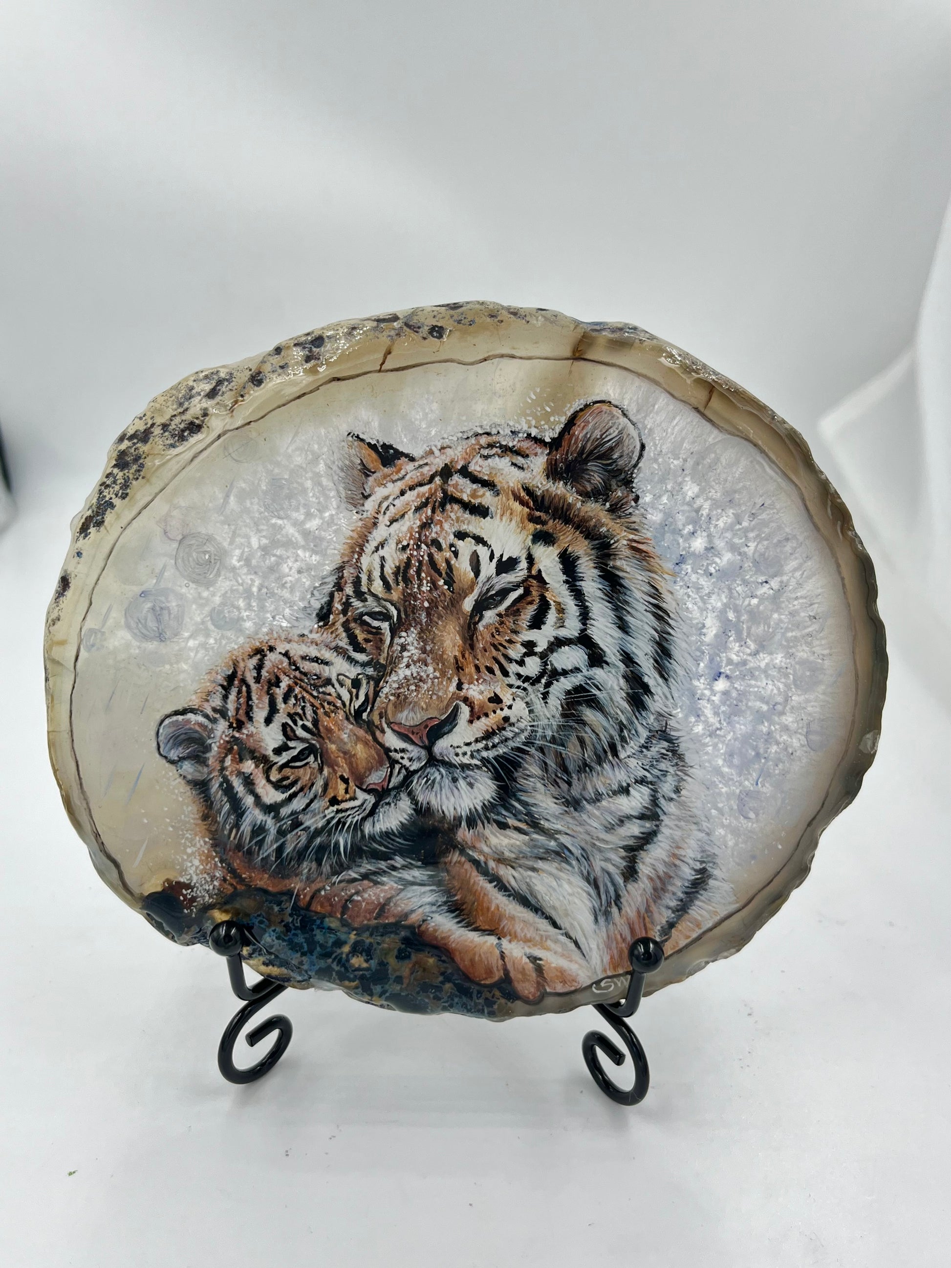 Einzigartige bemalt Achatscheibe/ Tiger Mama und Kind /Hand bemalt /Deko/Tierpotrait/ink.Metallständer