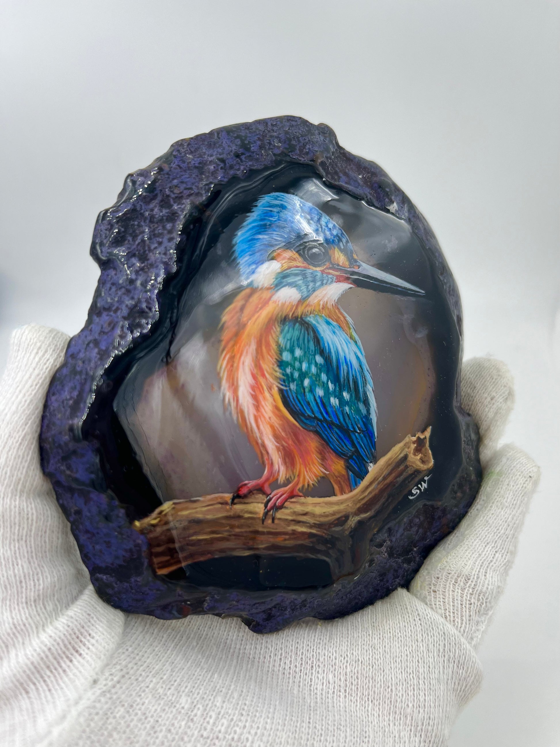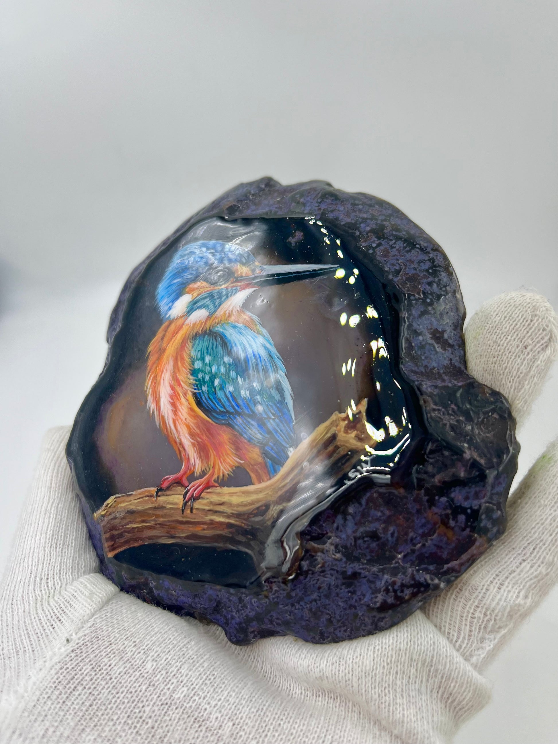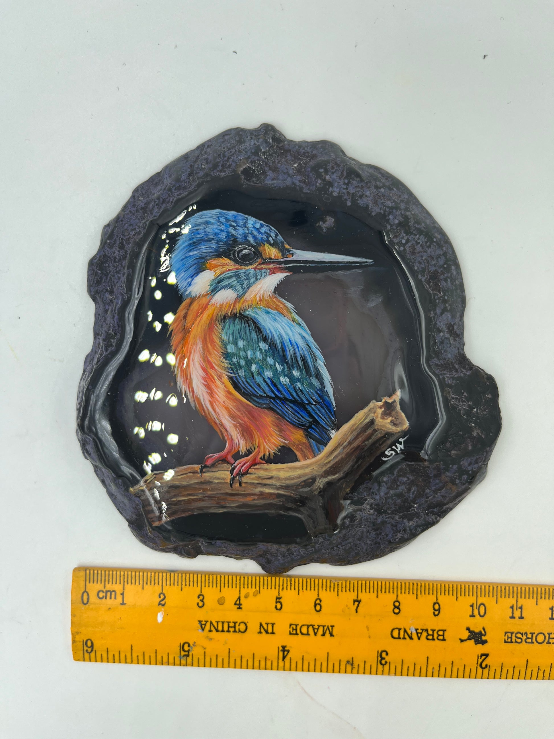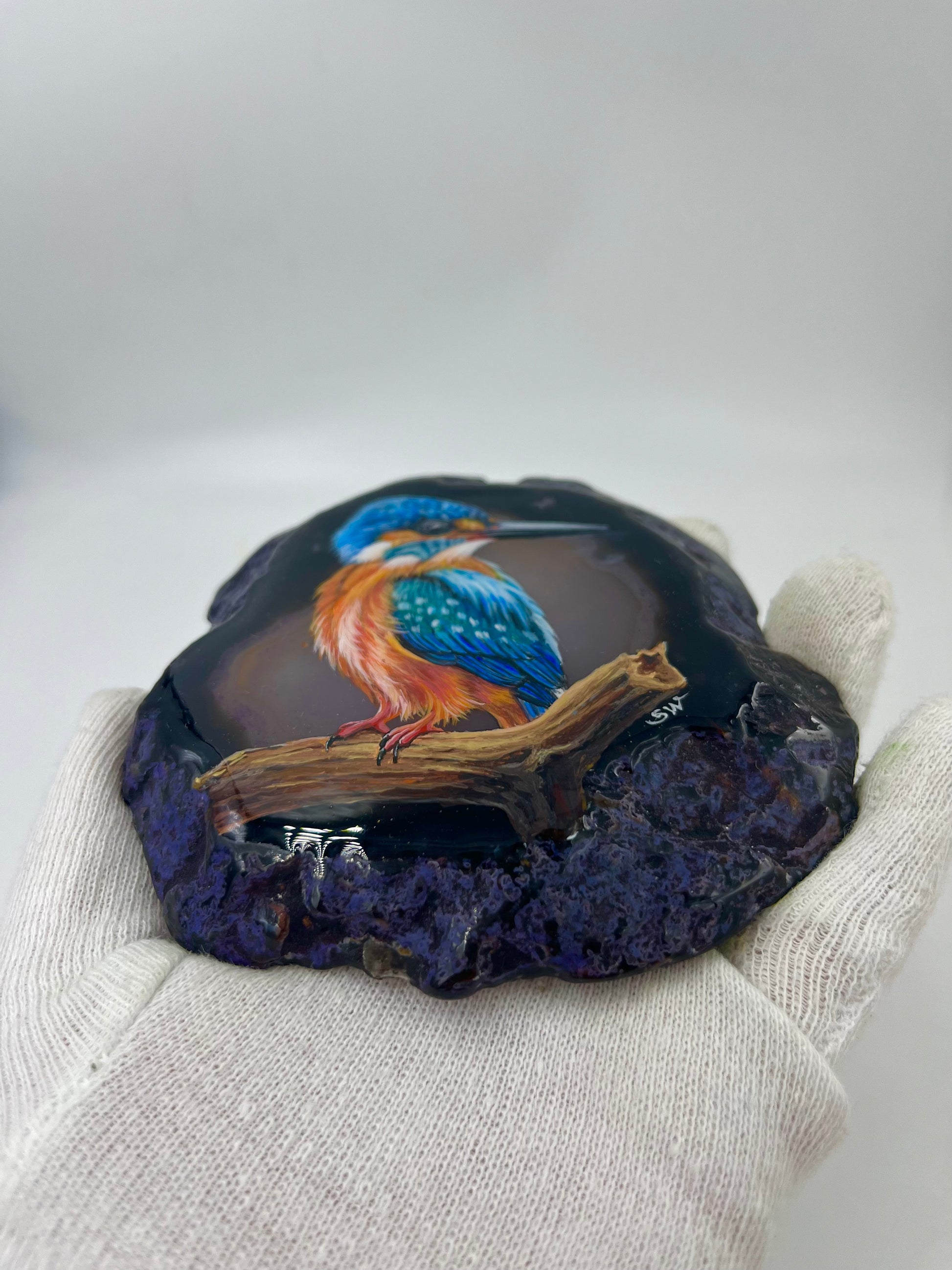 Einzigartige handbemalte Achatscheibe /der Eisvogel/ink.Metallständer