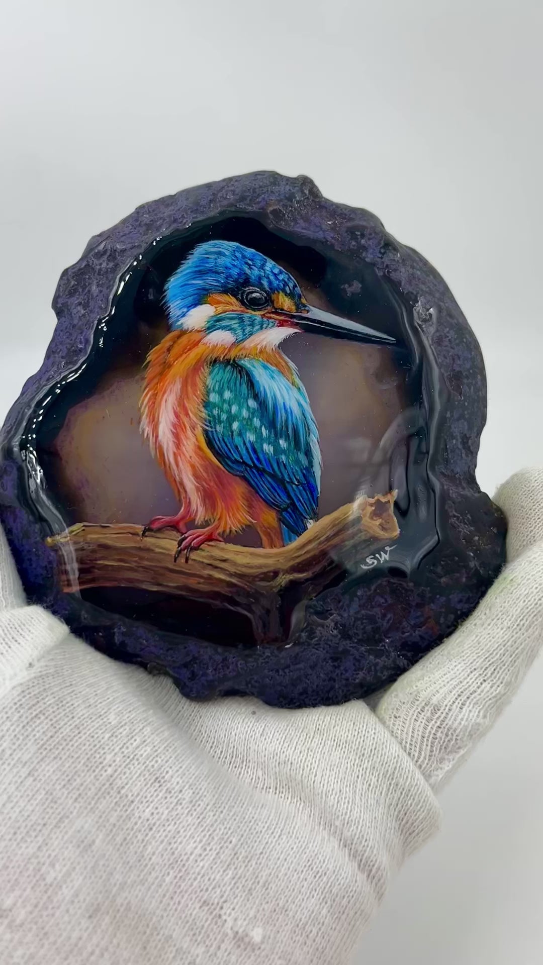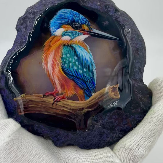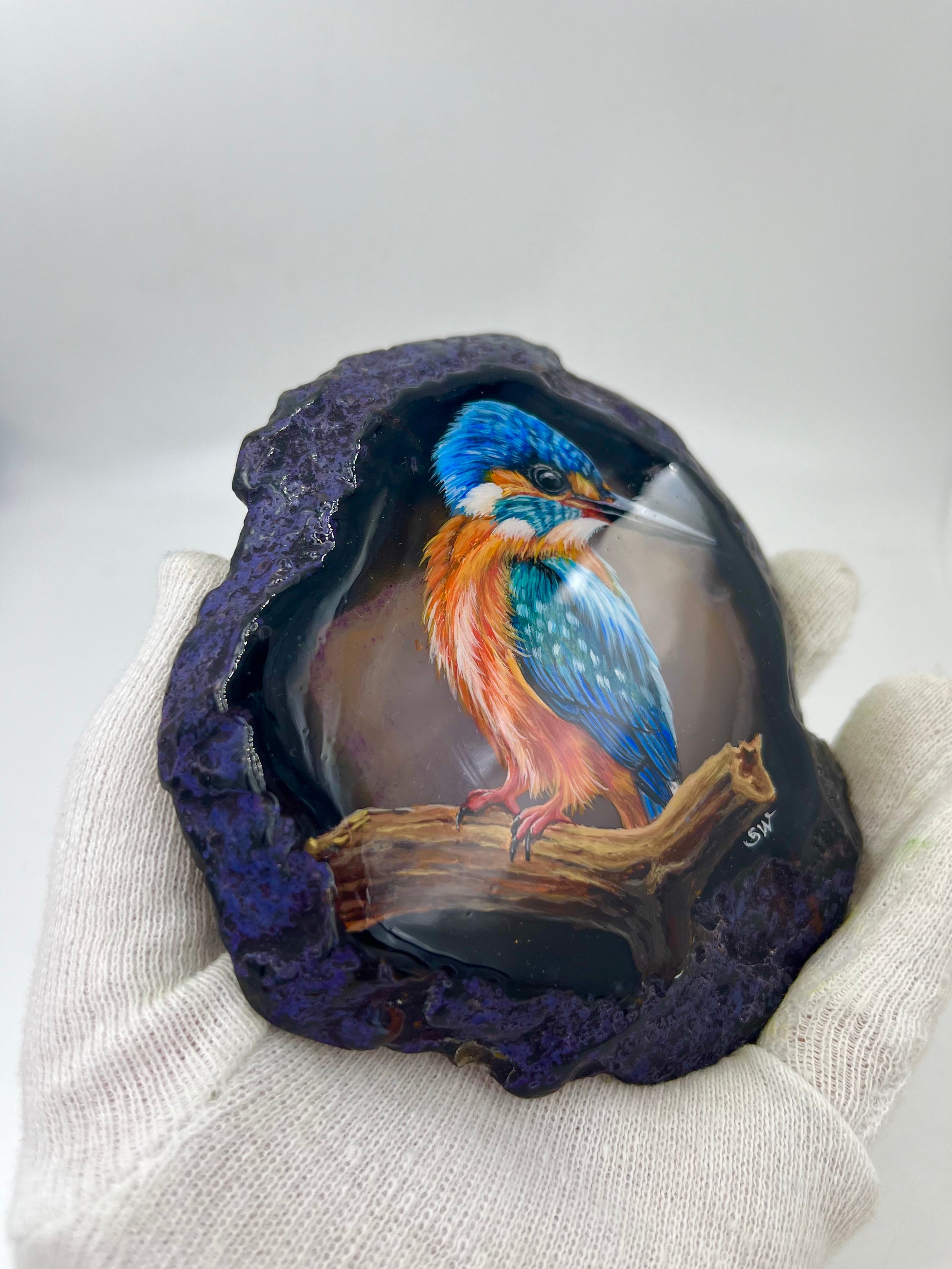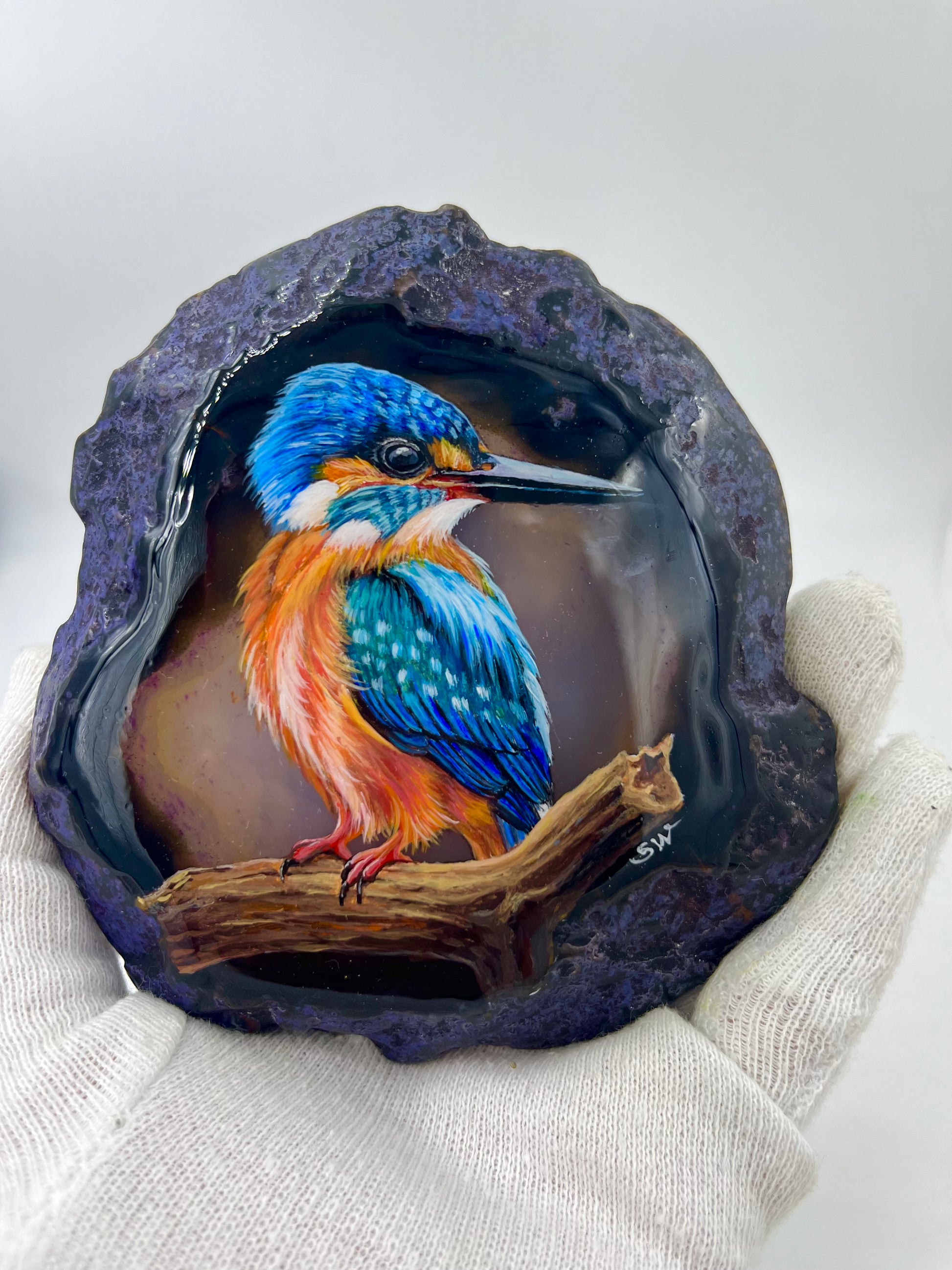 Einzigartige handbemalte Achatscheibe /der Eisvogel/ink.Metallständer
