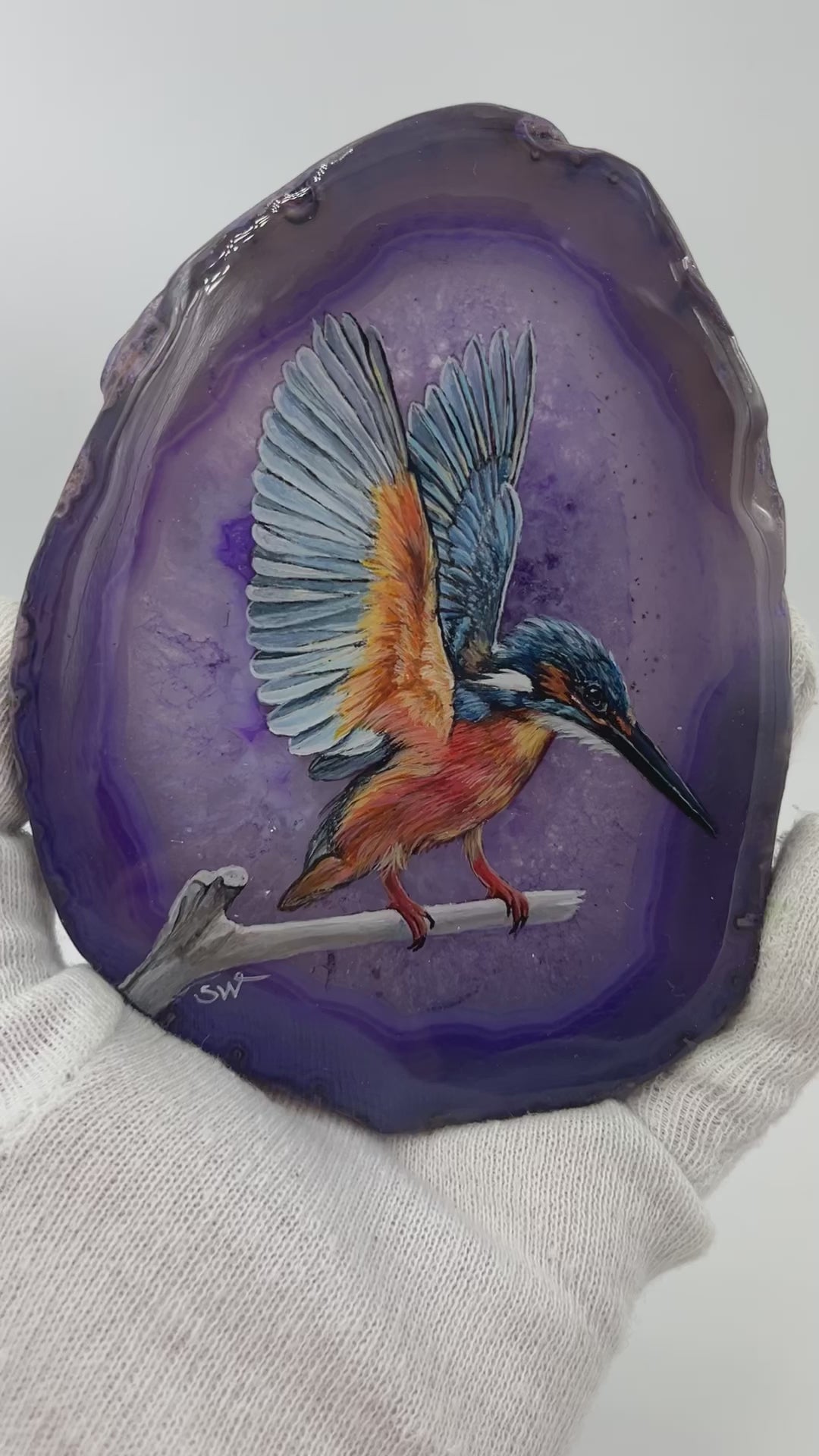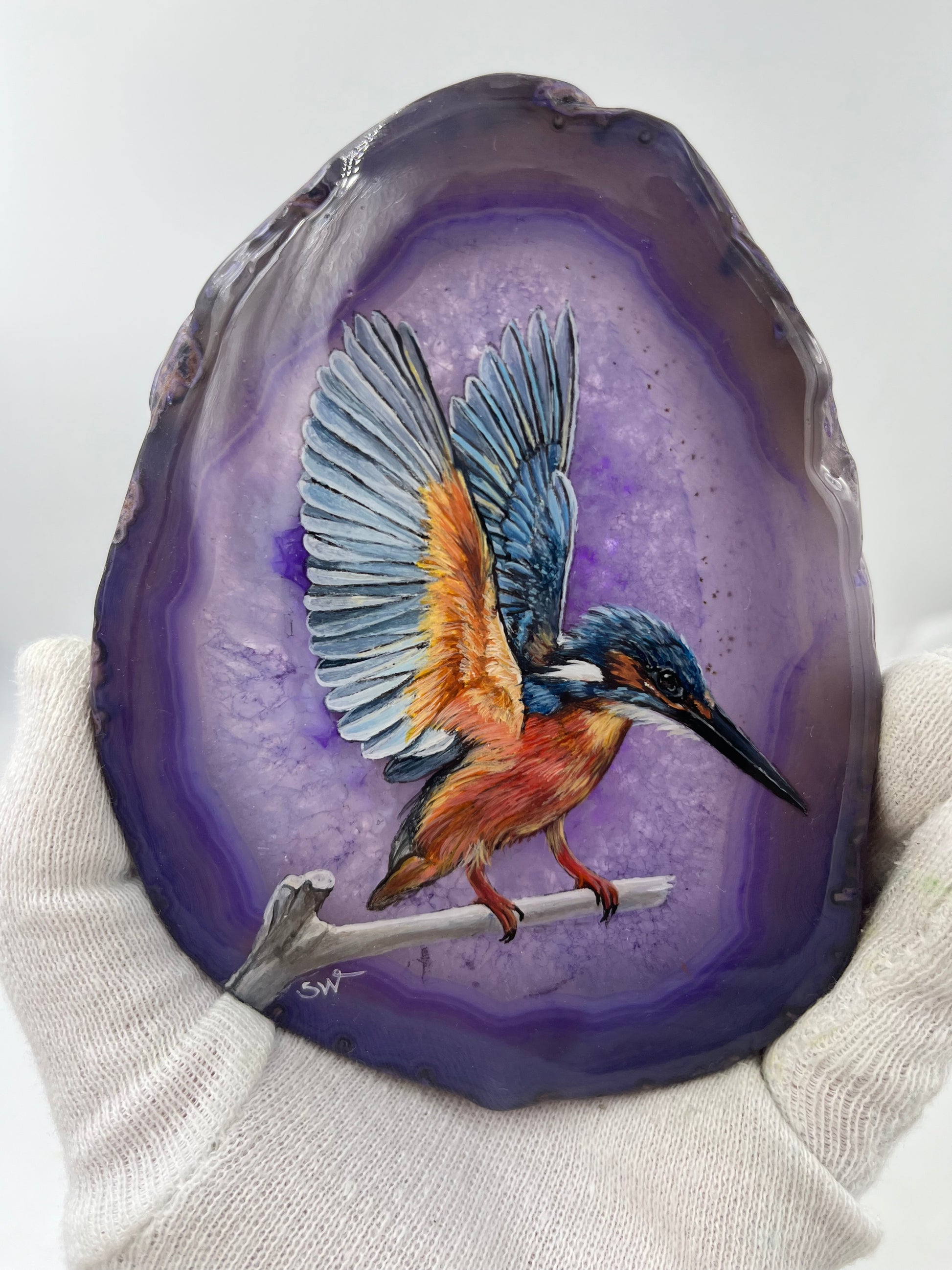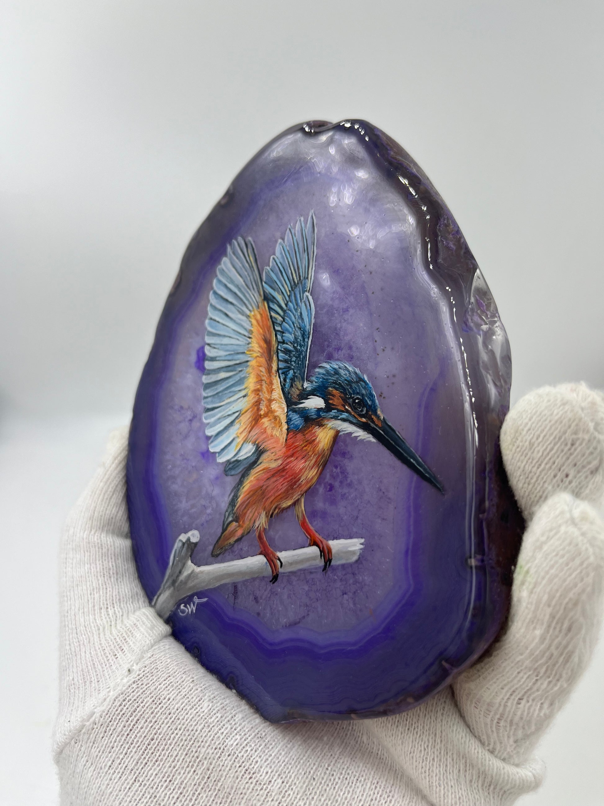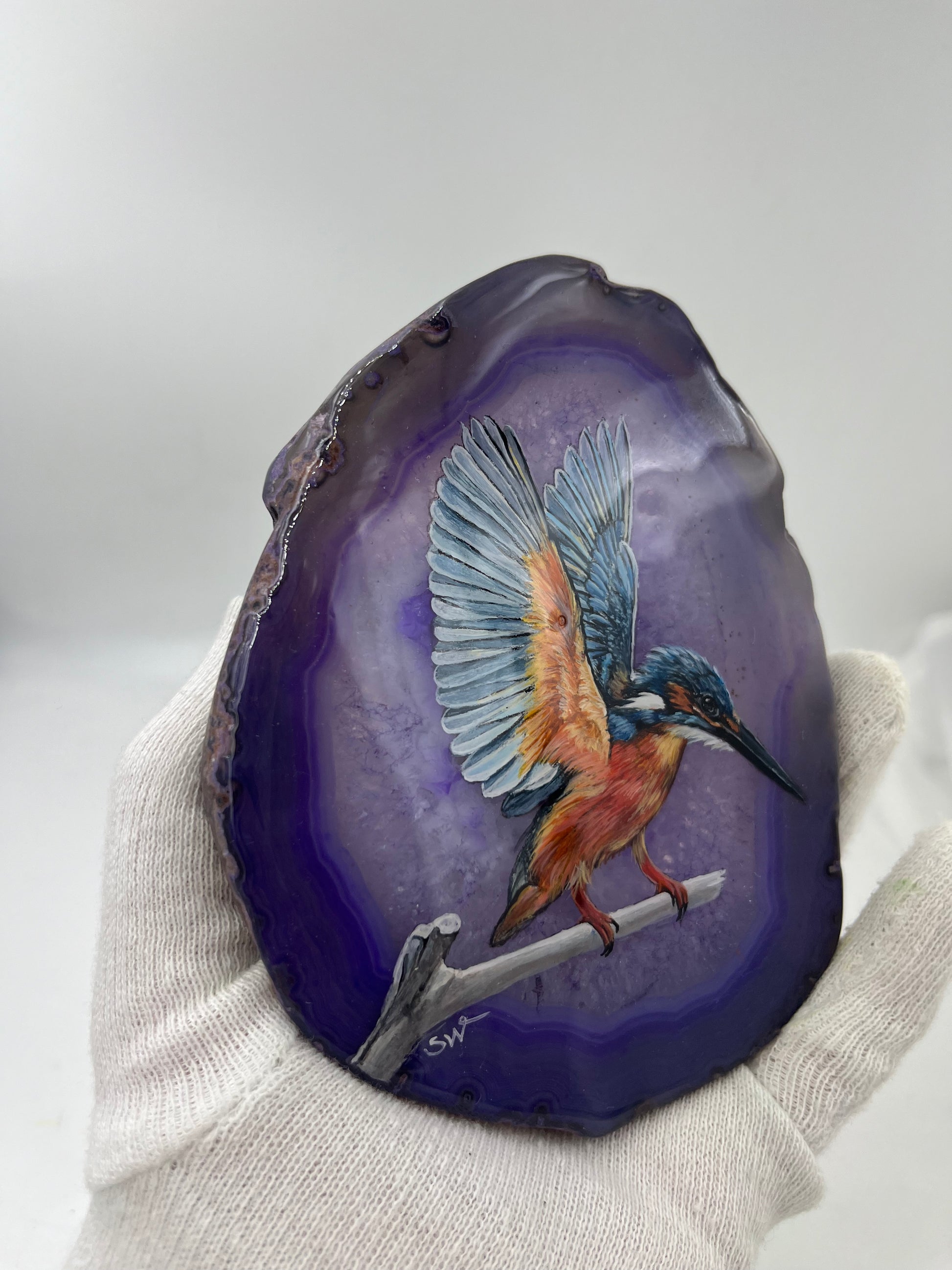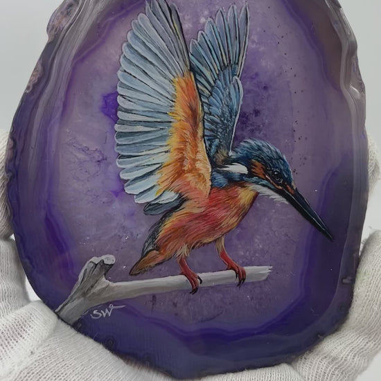 Einzigartige handbemalte Achatscheibe /der Eisvogel/ink.Metallständer