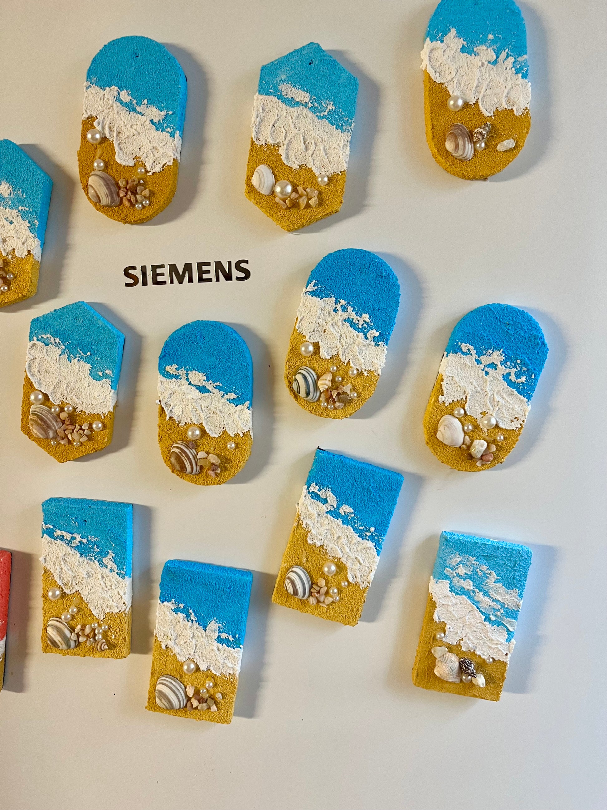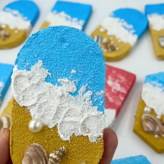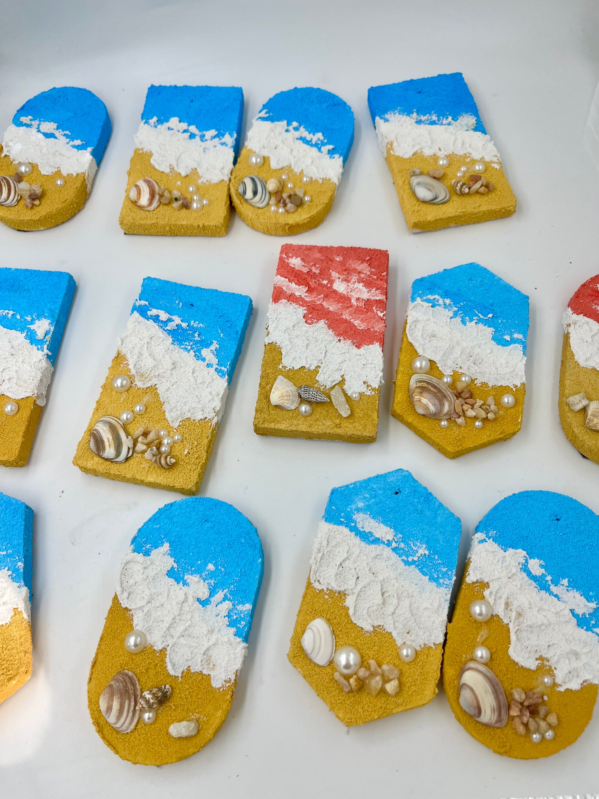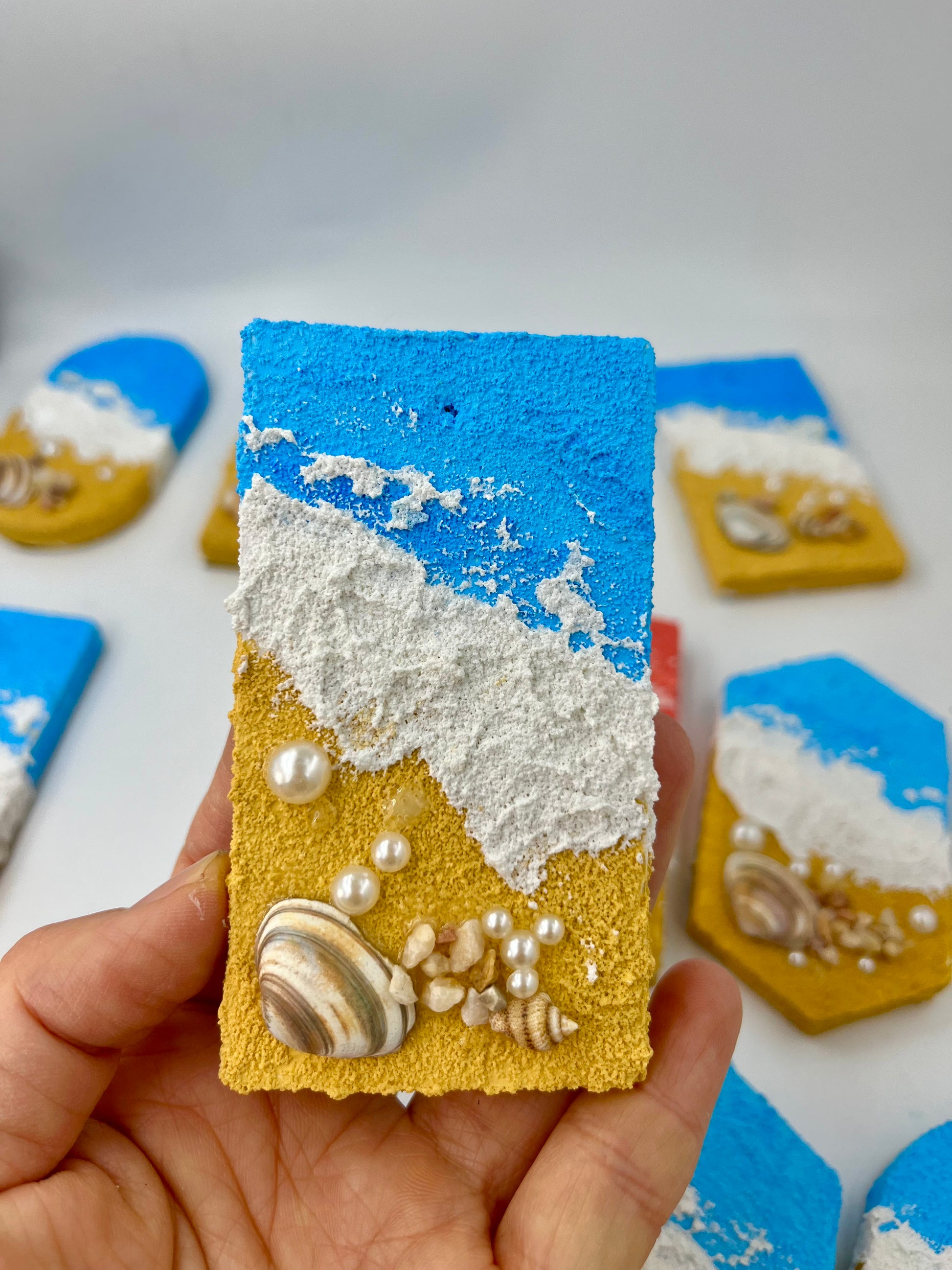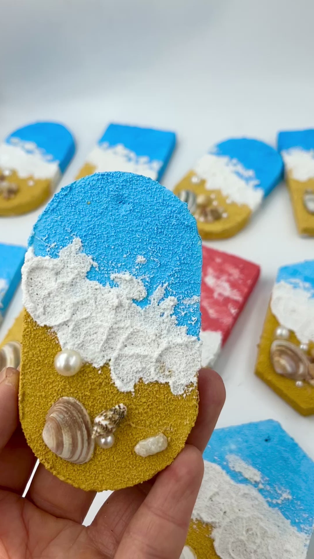 Dies ist eine handgefertigte Kühlschrankmagenet,der Hintergrund ist ein handgemachte Gipsstein , auf dem Gipsstein mit Acrylfarben und feinem Sand für das Meer Malerei, und schließlich mit natürlichen Muscheln, kleine Muscheln, kleine Steine schmücken, alle Produkte sind selbst handgefertigt.